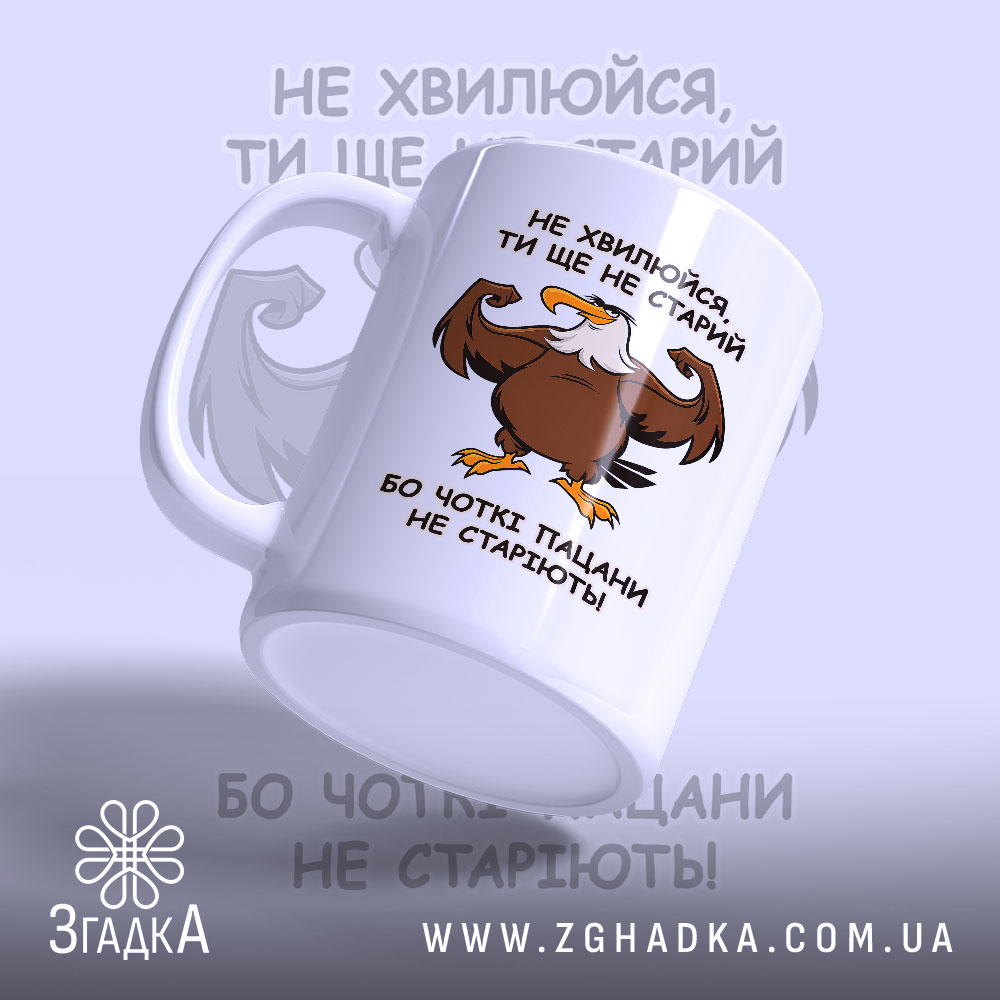 На чашці зображено потужного орла, який демонструє силу і впевненість. Текст на чашці говорить: ‘НЕ ХВИЛЮЙСЯ, ТИ ЩЕ НЕ СТАРИЙ’, що підкреслює молодіжний дух. Яскраві кольори, контрастний шрифт, який привертає увагу — це не просто чашка, а справжня заява.