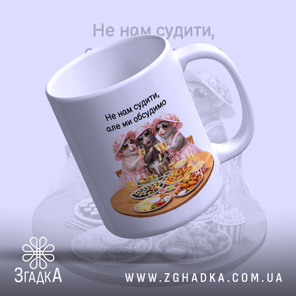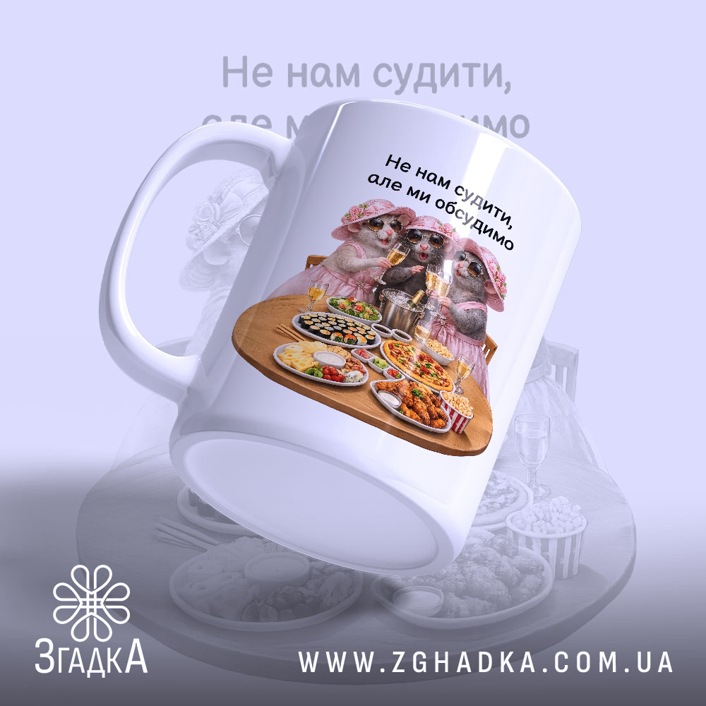 На чашці зображено трьох милих ведмедиків у рожевих капелюшках, які святкують з келихами шампанського. Яскраві кольори, весела композиція, що передає атмосферу свята. Напис ‘Не нам судити, але ми обговоримо’ додає іронічного настрою.