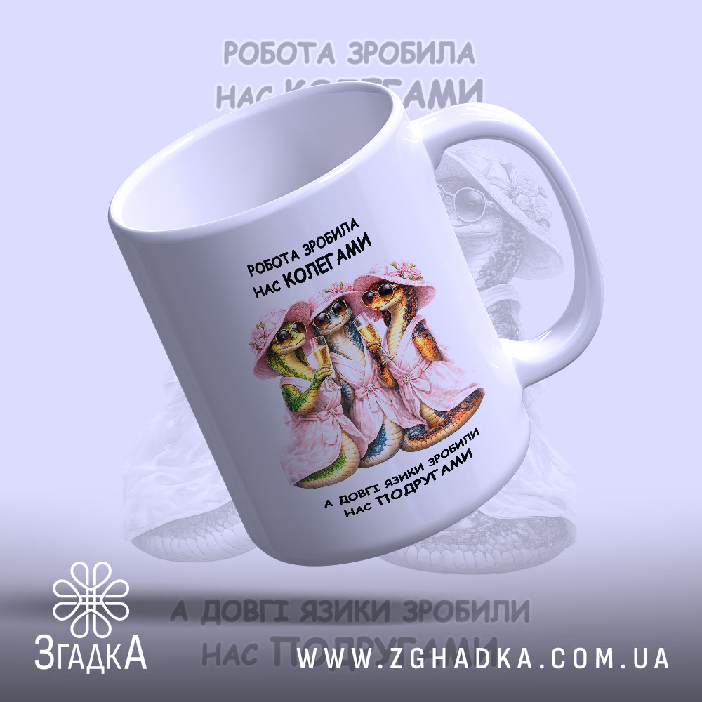 На чашці зображено трьох ящірок у рожевих капелюшках, які святкують з келихами. Яскраві кольори, весела композиція, що викликає усмішку. Напис на чашці говорить: ‘Робота зробила нас колегами, а довгі язики зробили нас подругами’.