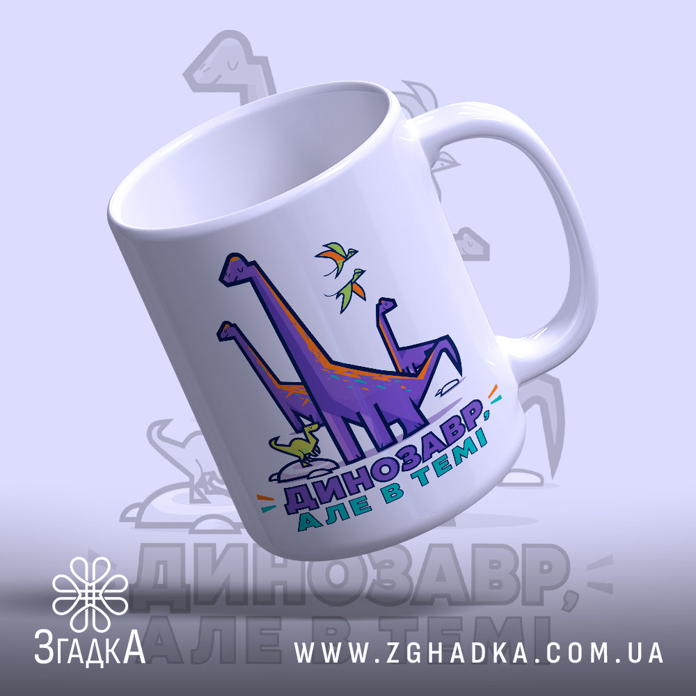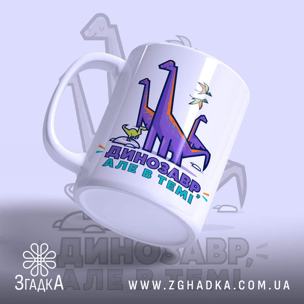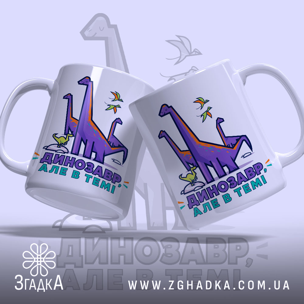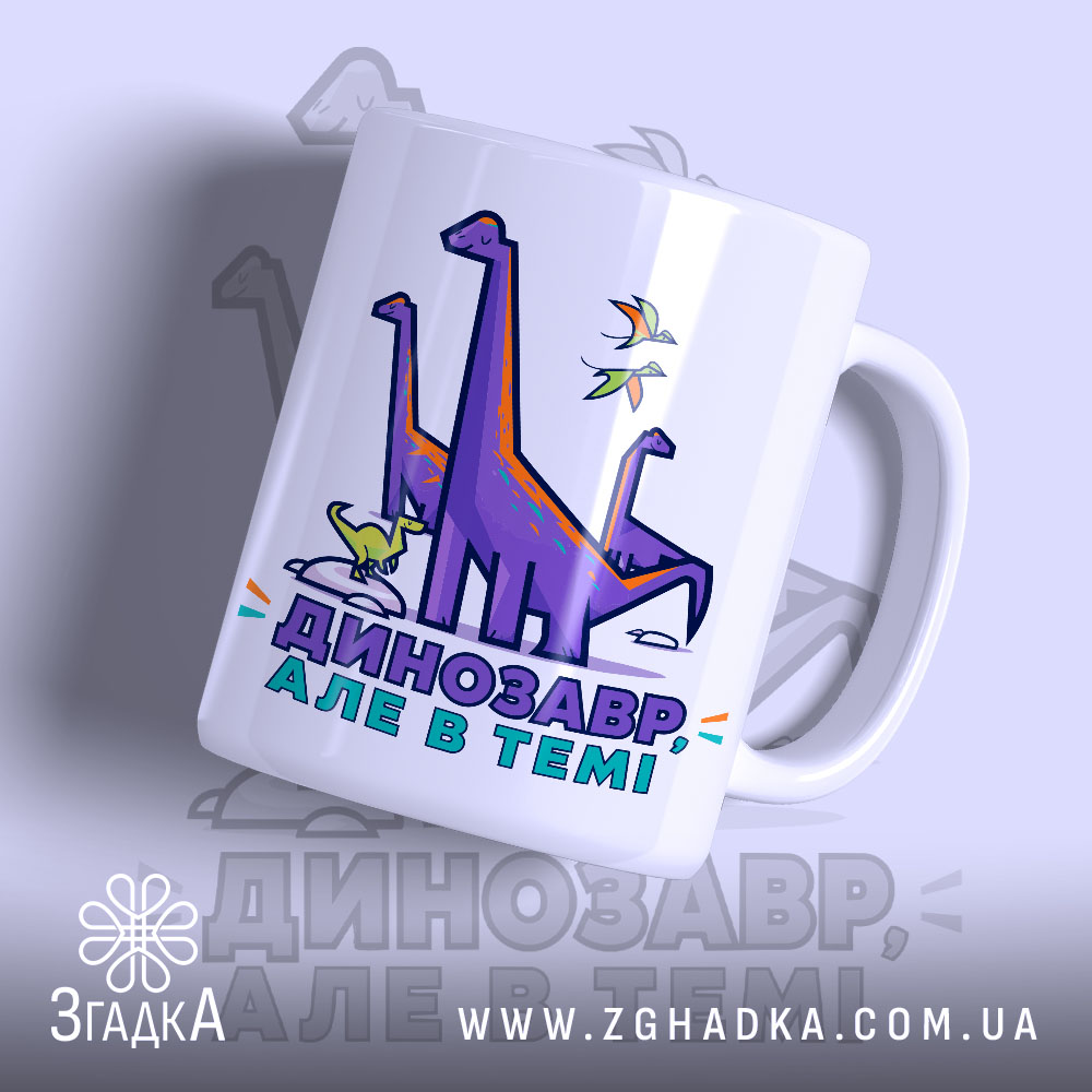 На чашці зображено веселих динозаврів, які грайливо позують на фоні яскравих кольорів. Стиль — сучасний, з елементами поп-арту. Напис ‘ДИНОЗАВР, АЛЕ В ТЕМІ’ виконаний у сміливому шрифті, що підкреслює кумедність та креативність дизайну.
