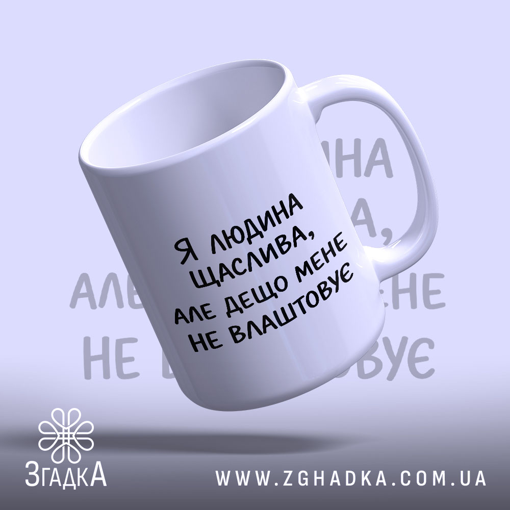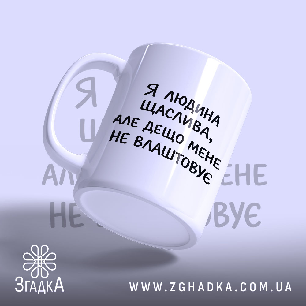 Принт на чашці вражає своєю простотою та глибиною. На білому фоні великими чорними літерами написано: ‘Я людина щаслива, але дещо мене не влаштвує’. Цей текст викликає роздуми, спонукає до саморефлексії. Стиль напису — сучасний, чіткий, з емоційним підтекстом.