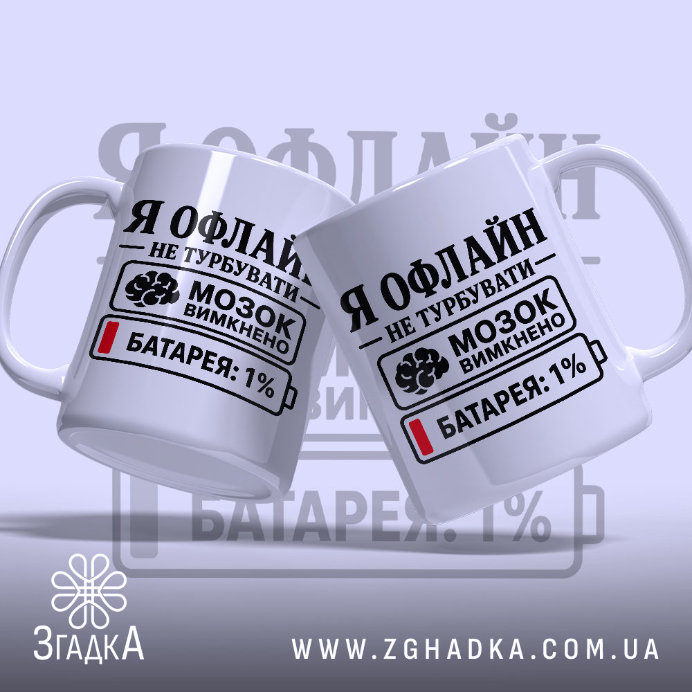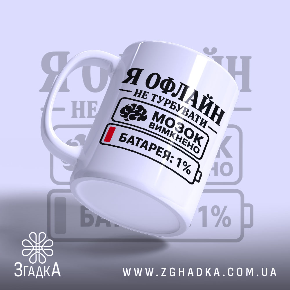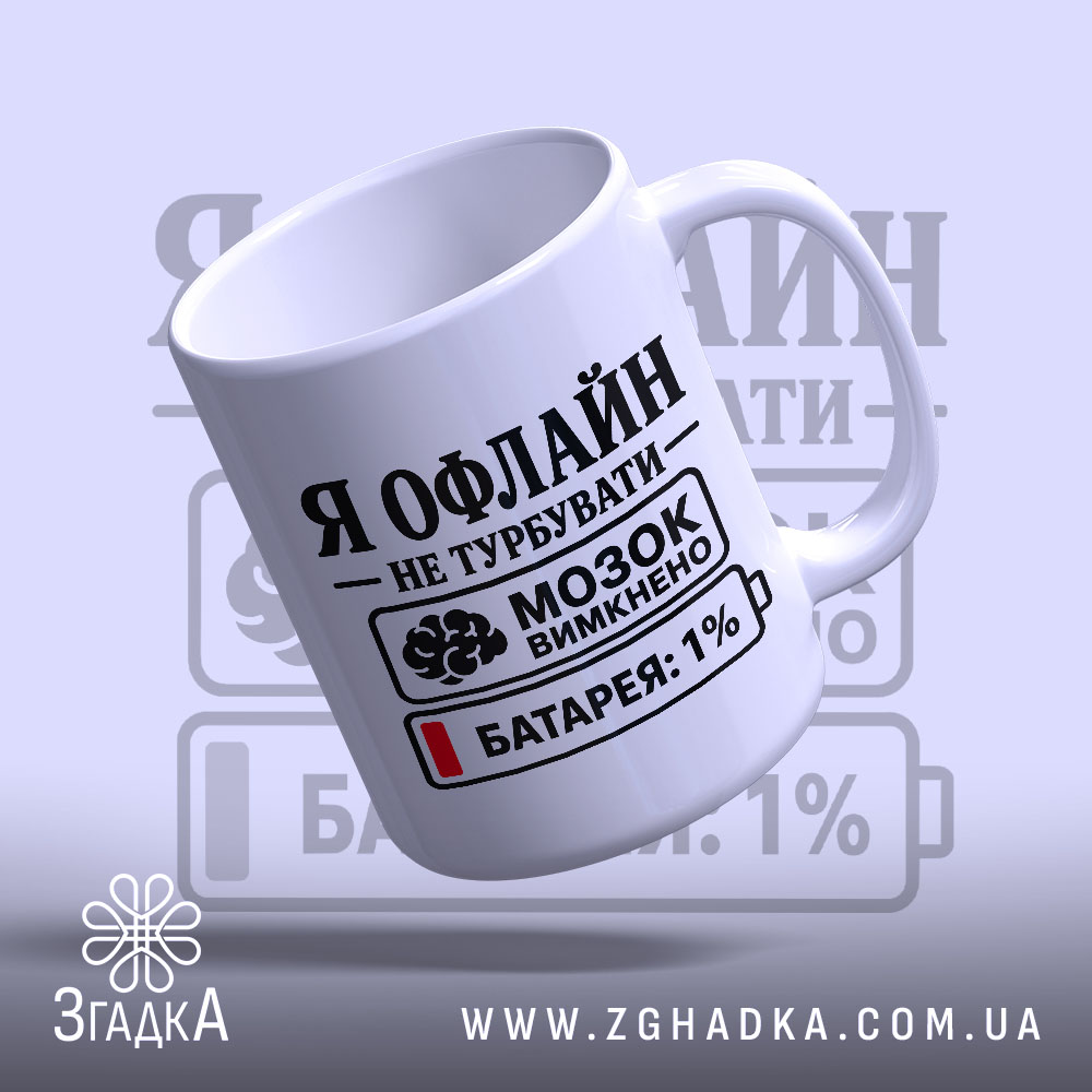 На чашці зображено яскравий напис: ‘Я ОФЛАЙН НЕ ТУРБУВАТИ’. Стильний шрифт, що підкреслює важливість особистого простору. Додаткові елементи — іконка мозку та індикатор батареї, що створює іронічний настрій. Чорний текст на білому фоні виглядає стильно і сучасно.