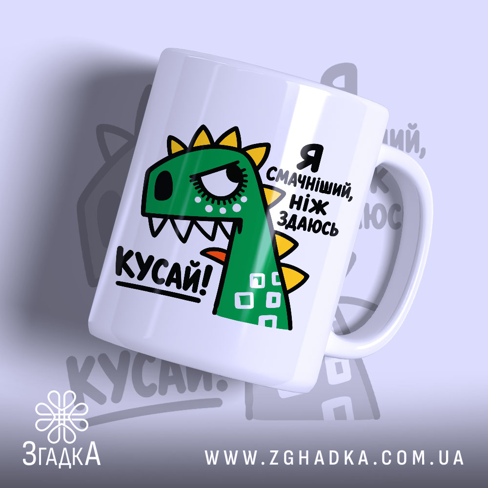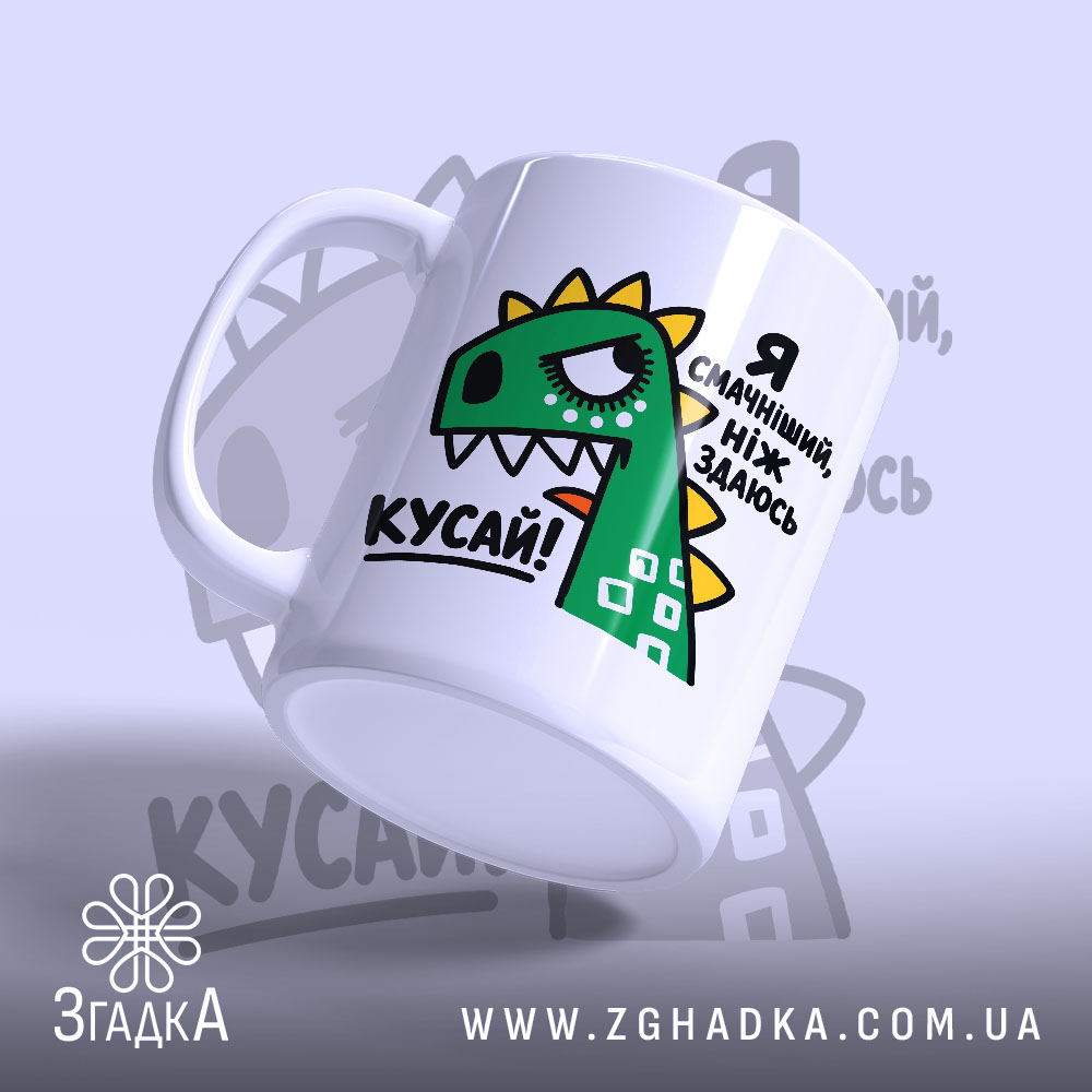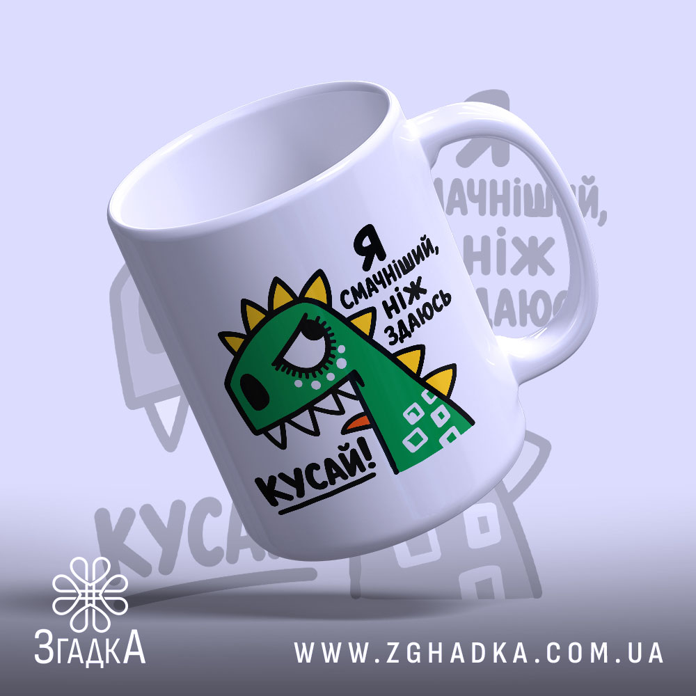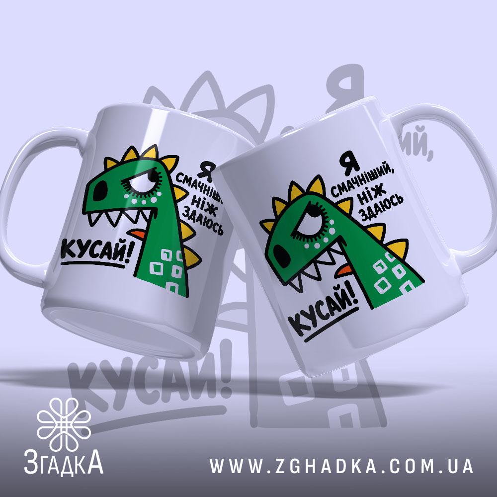 На чашці зображено кумедного динозавра з виразом обличчя, що викликає усмішку. Яскравий зелений колір доповнений жовтими шипами та білими візерунками. Напис ‘Я смачніший, ніж здаюсь’ виглядає стильно і привертає увагу, а слово ‘Кусай!’ додає нотку жарту.