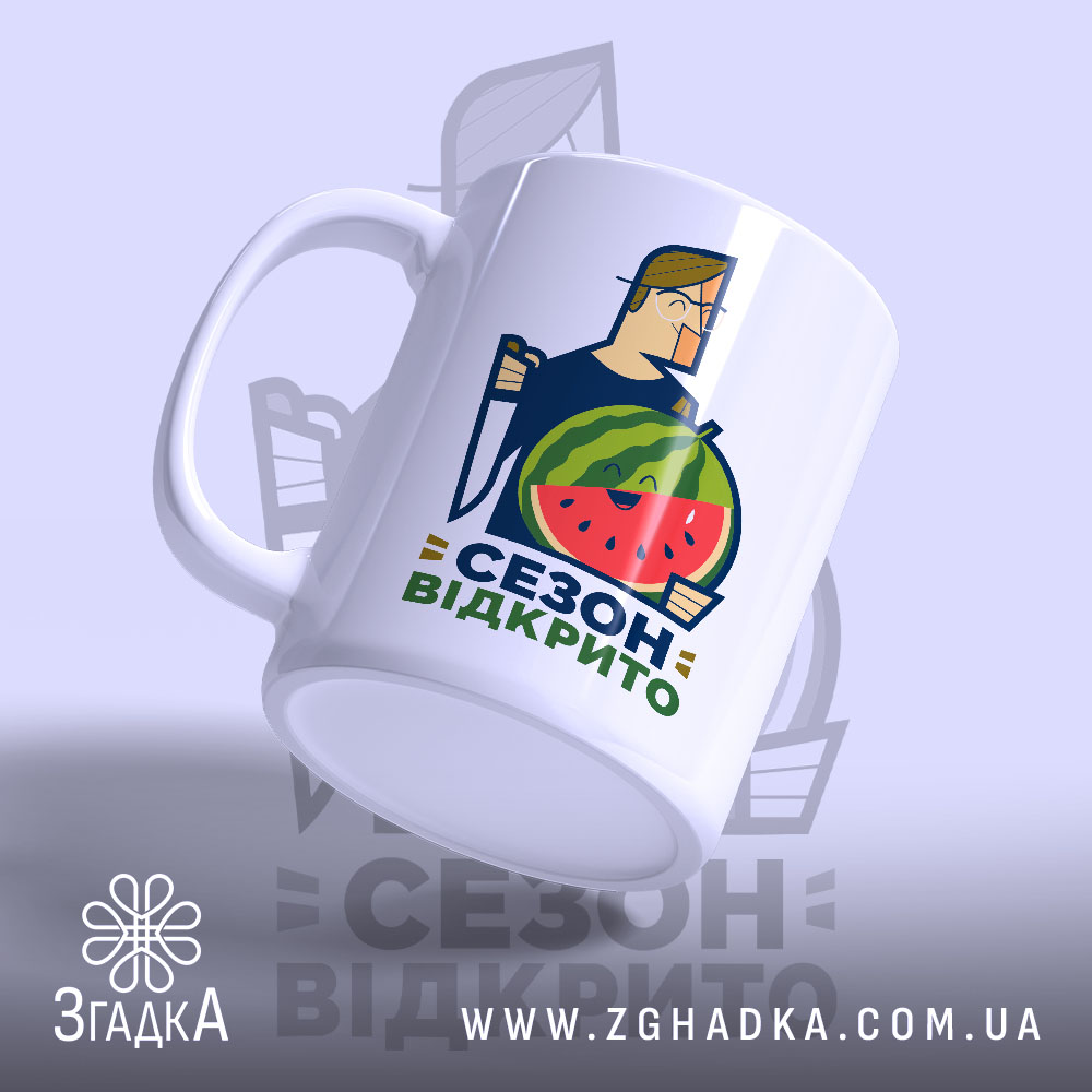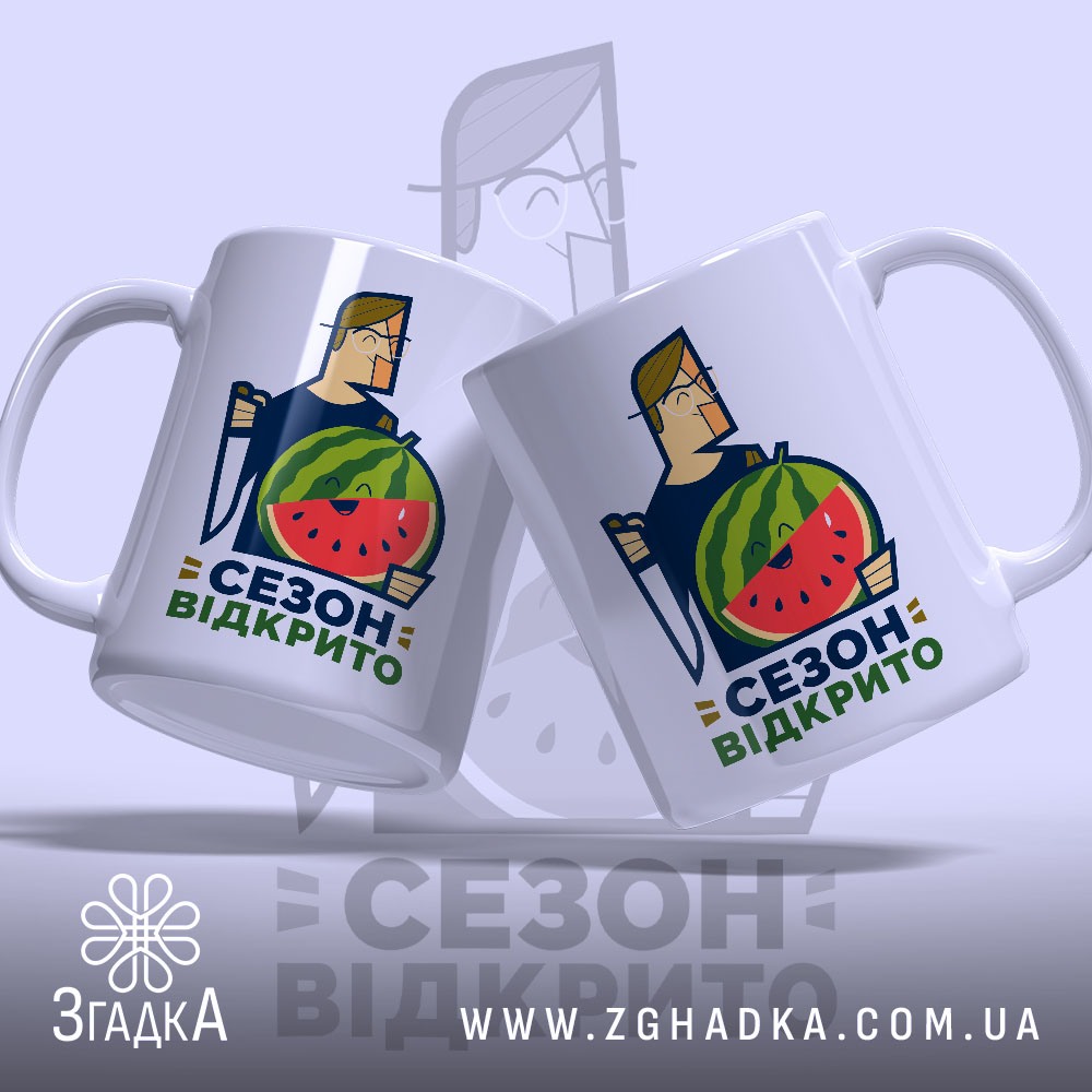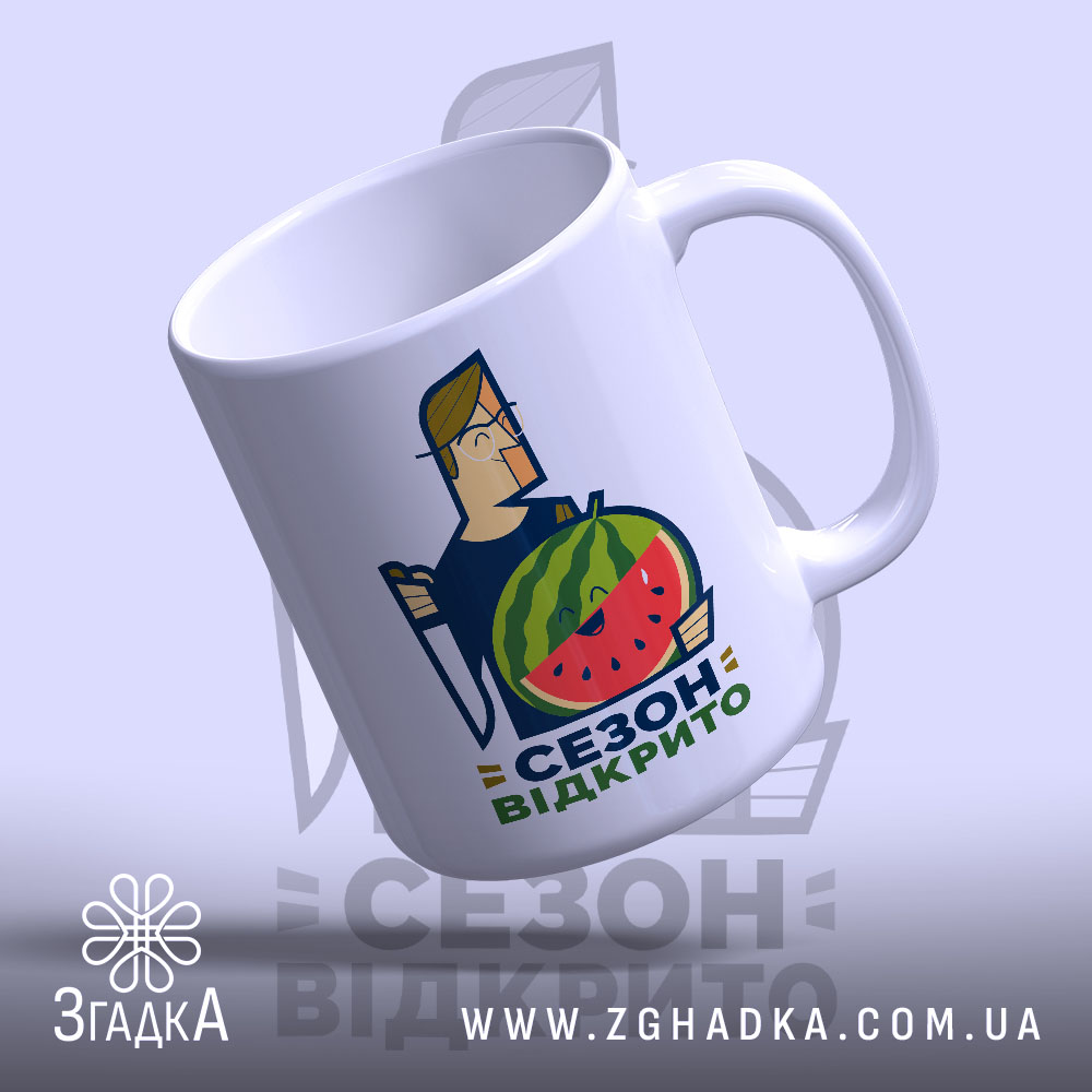 На чашці зображено веселого персонажа, що тримає кавун, з написом ‘СЕЗОН ВІДКРИТО’. Яскраві кольори, що поєднують зелений, червоний та жовтий, створюють позитивний настрій. Стиль ілюстрації — сучасний, з елементами графічного дизайну, що привертає увагу.