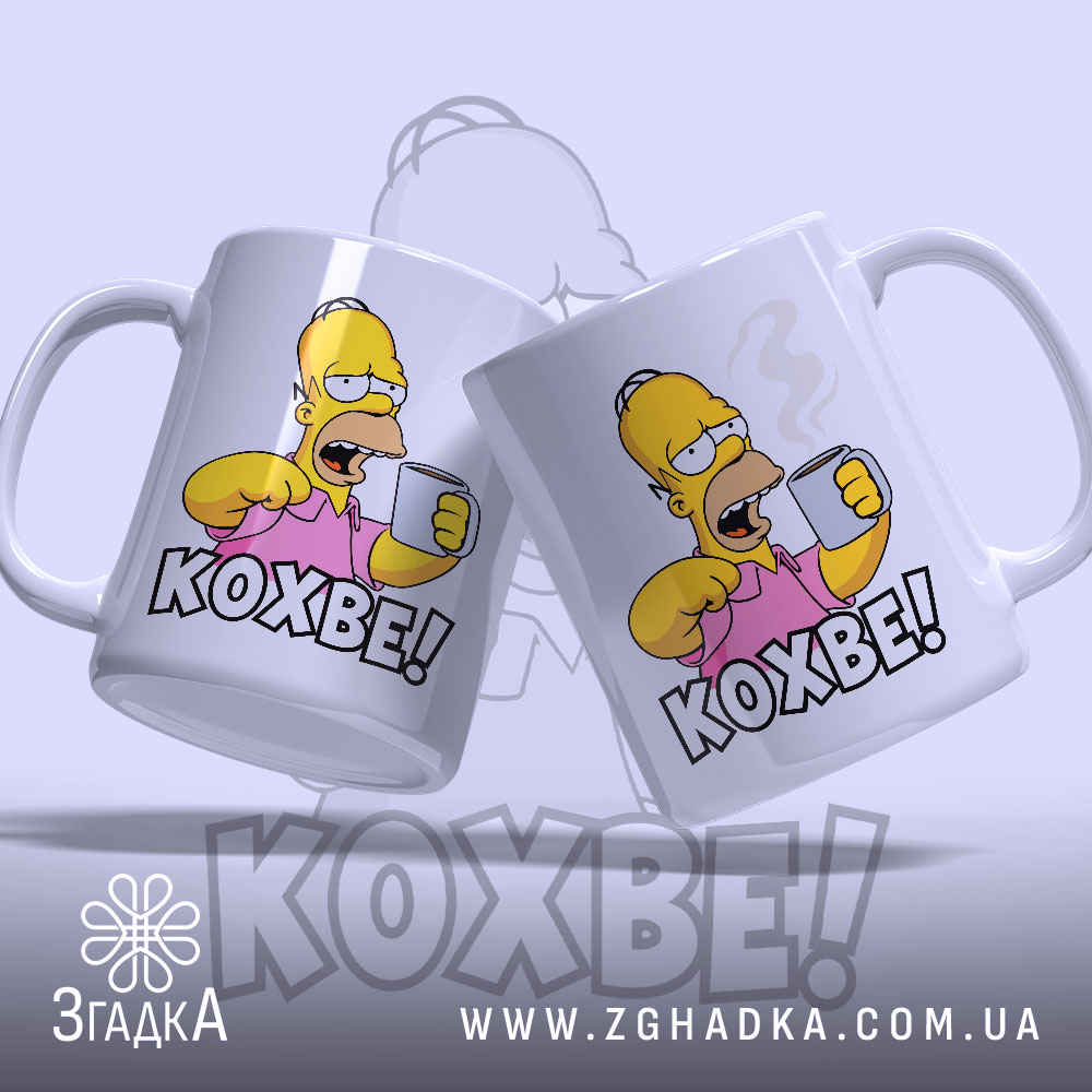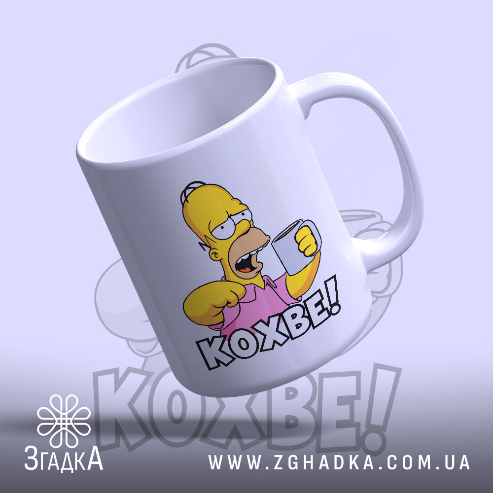 На чашці зображено персонажа, який тримає чашку з кавою. Яскраві кольори, зокрема жовтий та рожевий, створюють веселий настрій. Напис ‘КОХВЕ!’ виконаний великими літерами, що підкреслює емоційність та енергію.