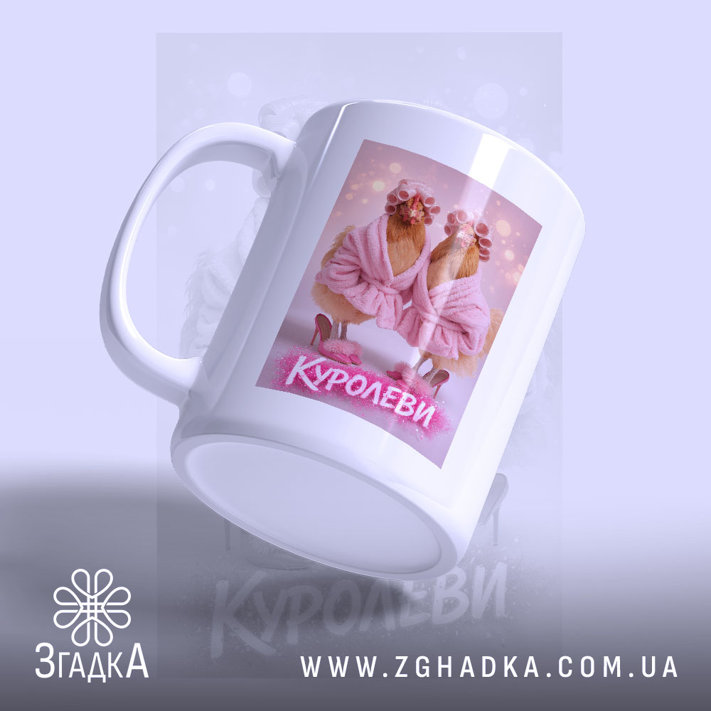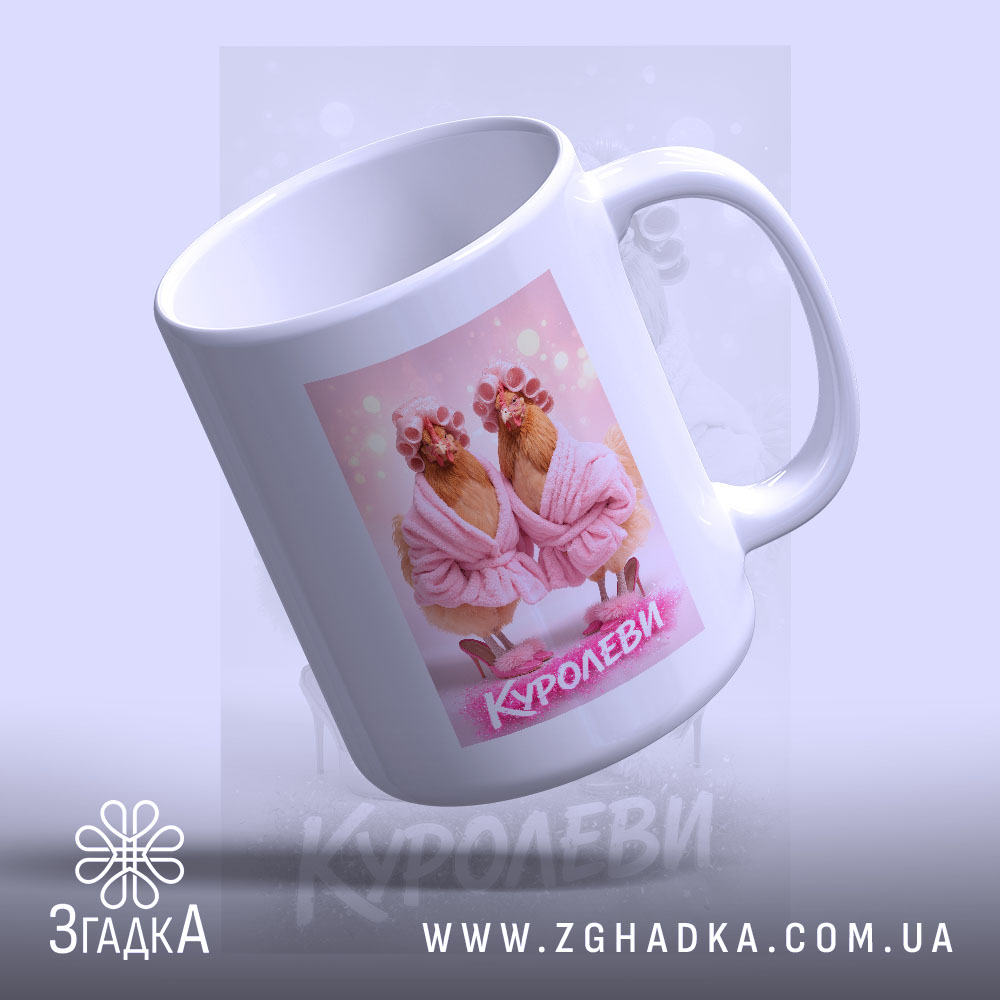 Дві гламурні курочки в ніжних халатах, з кучериками на головах, готові до свята. Яскраві кольори та веселий стиль підкреслюють їхній шик. Напис “Куролеви” виконаний у грайливому шрифті, що додає ще більше шарму. Це не просто чашка, це емоційний акцент у вашому житті.