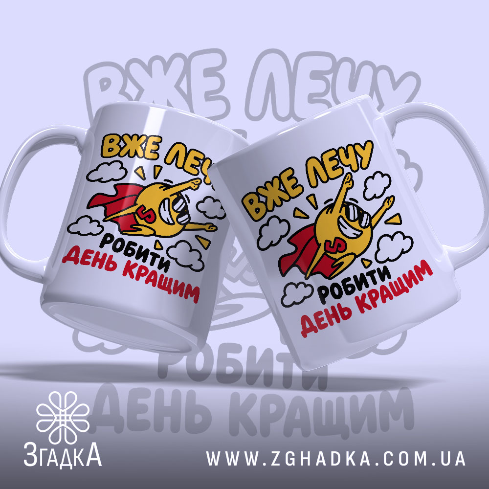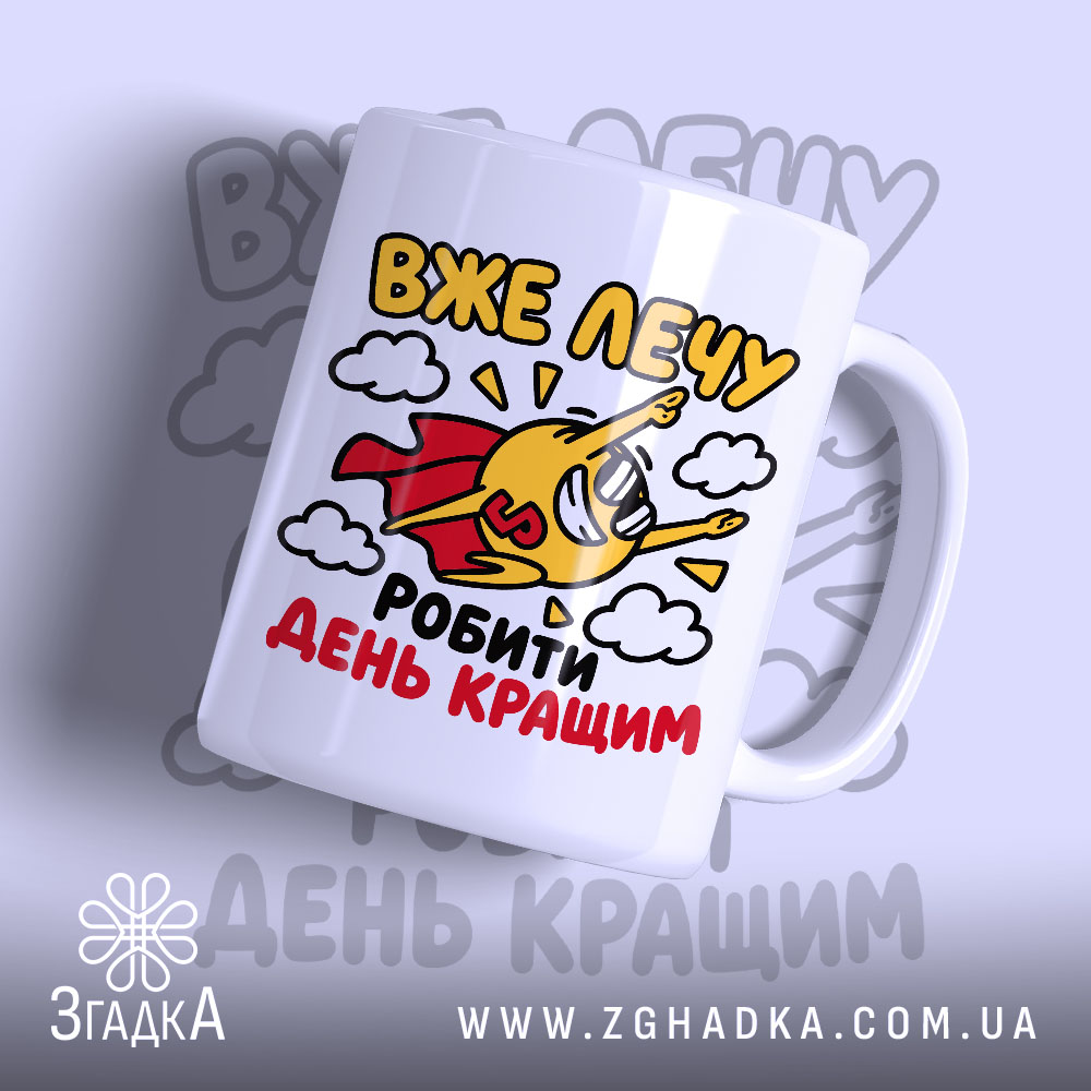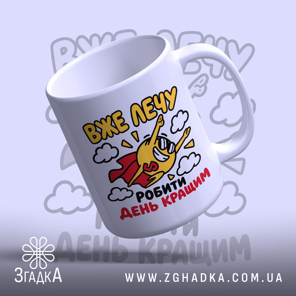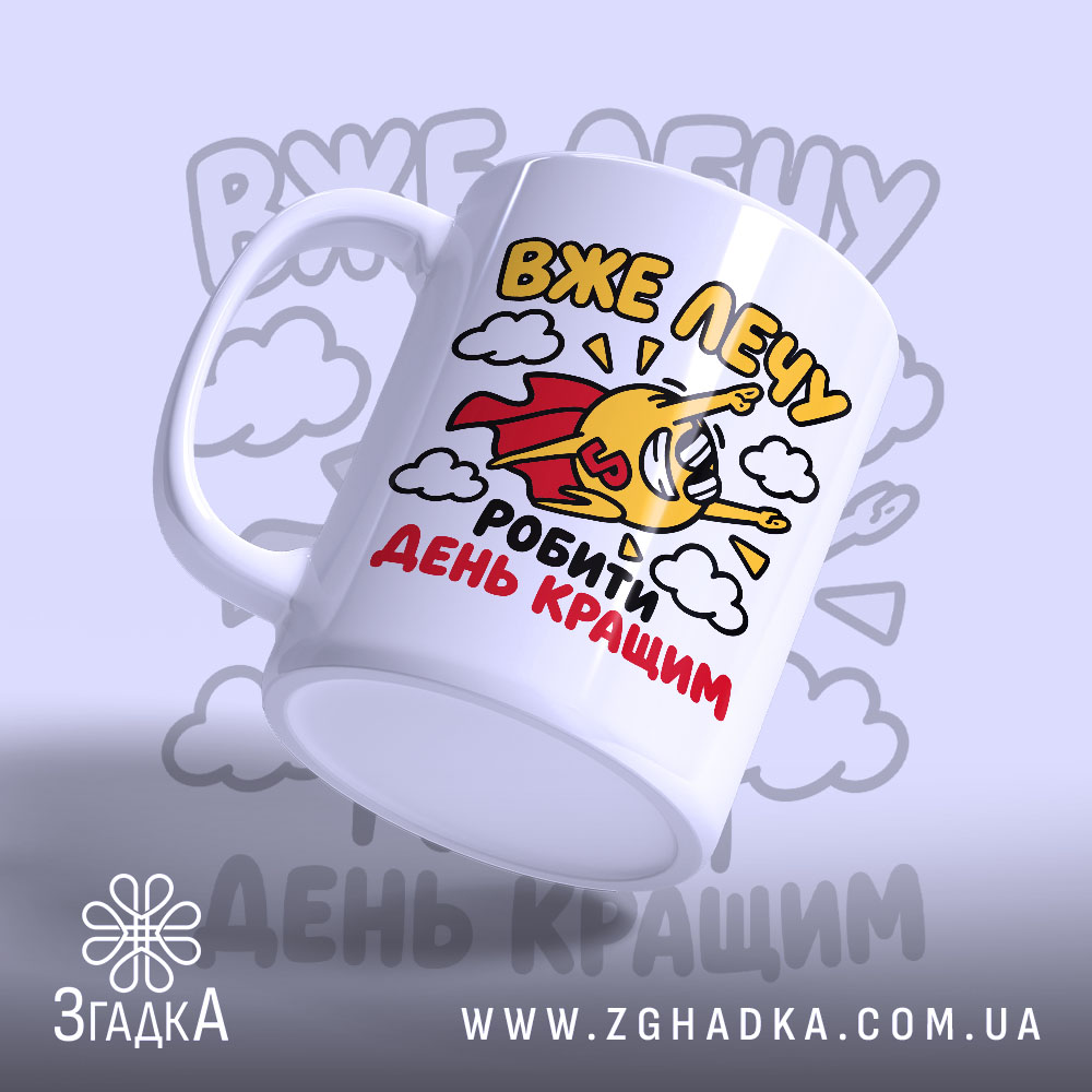 На чашці зображено веселого персонажа у червоному плащі, який летить серед хмар. Яскраві кольори: жовтий, червоний та блакитний, створюють позитивний настрій. Текст “ВЖЕ ЛЕЧУ” та “РОБИТИ ДЕНЬ КРАЩИМ” виконаний у динамічному стилі, що підкреслює енергію та радість.