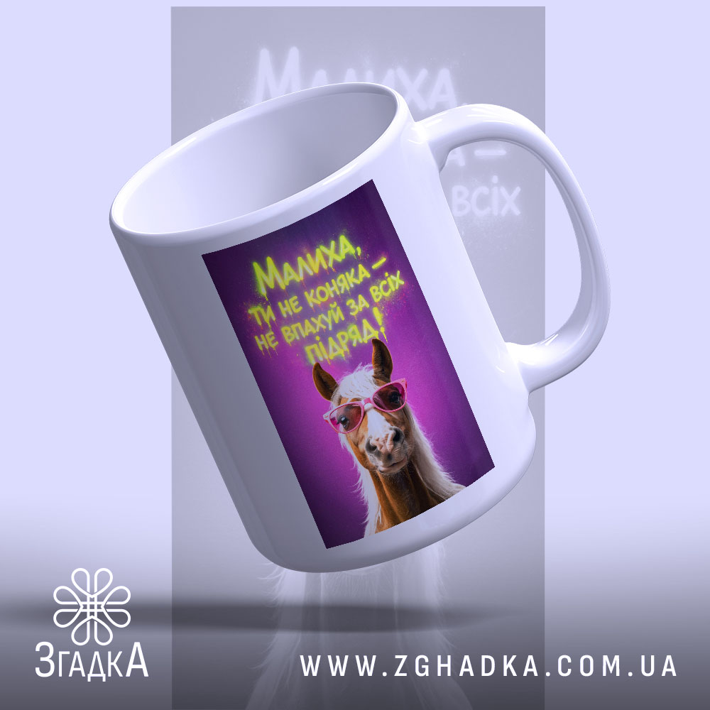 На чашці зображено кумедного коня в рожевих окулярах, який виглядає впевнено. Яскравий фон у фіолетових та зелених тонах створює веселий настрій. Напис великими літерами: ‘Малиха, ти не коняка — не вплаюй за всіх підряд!’ — виглядає як запрошення до дії.