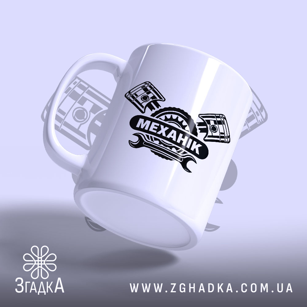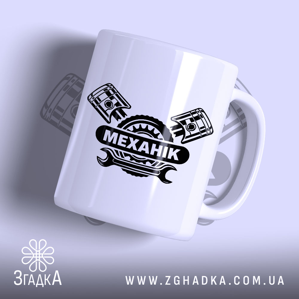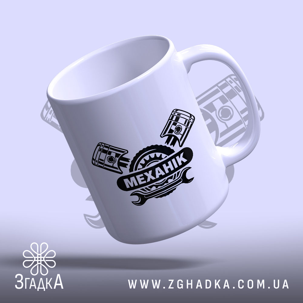 На чашці зображено стильний принт із написом ‘МЕХАНІК’, оточеним елементами механіки. Чорний текст на білому фоні створює контраст, а деталі, як поршні, додають динаміки. Це не просто чашка, це вираження вашої пристрасті до механіки.
