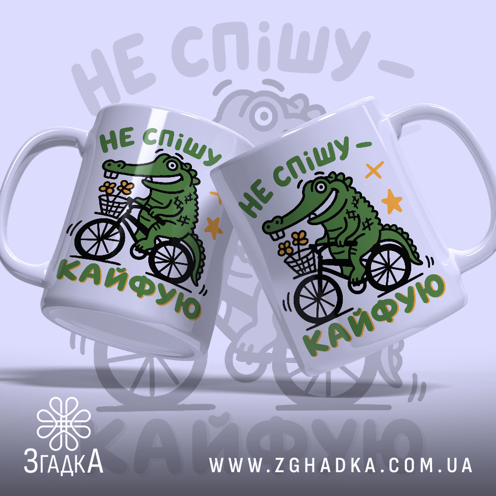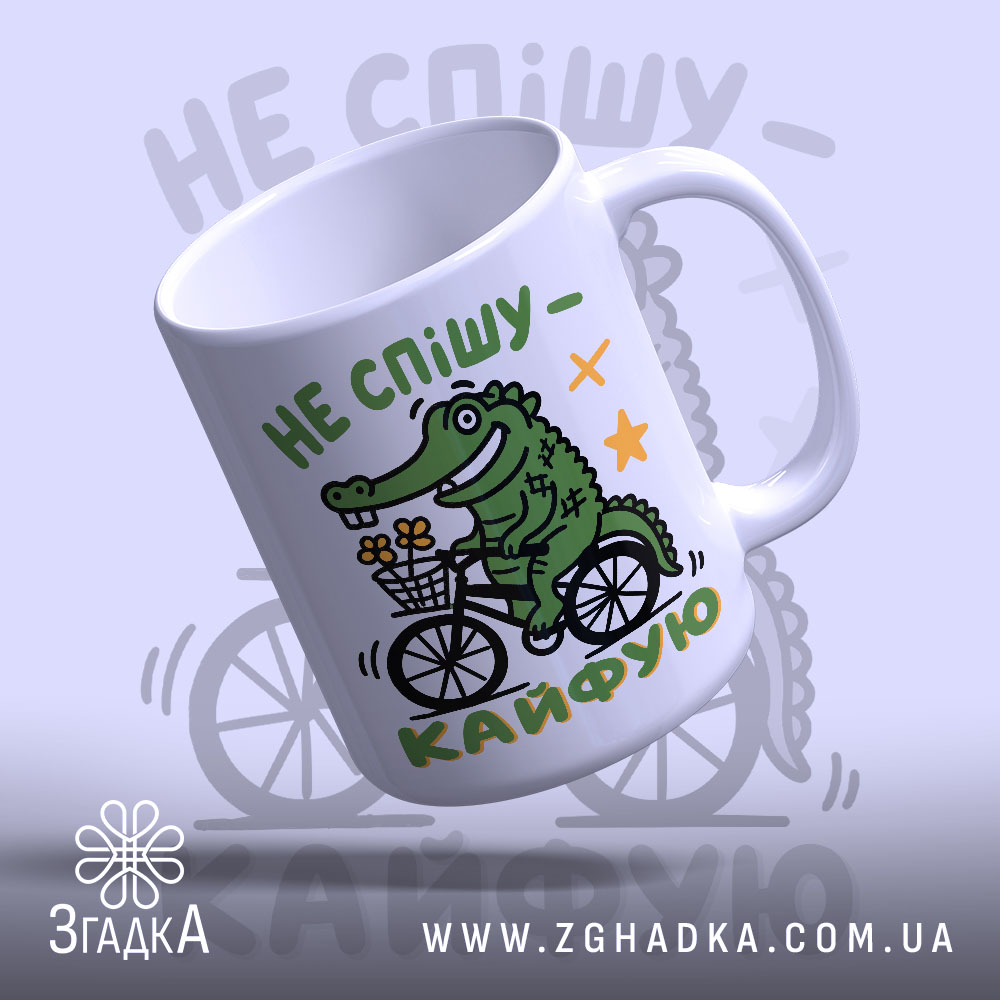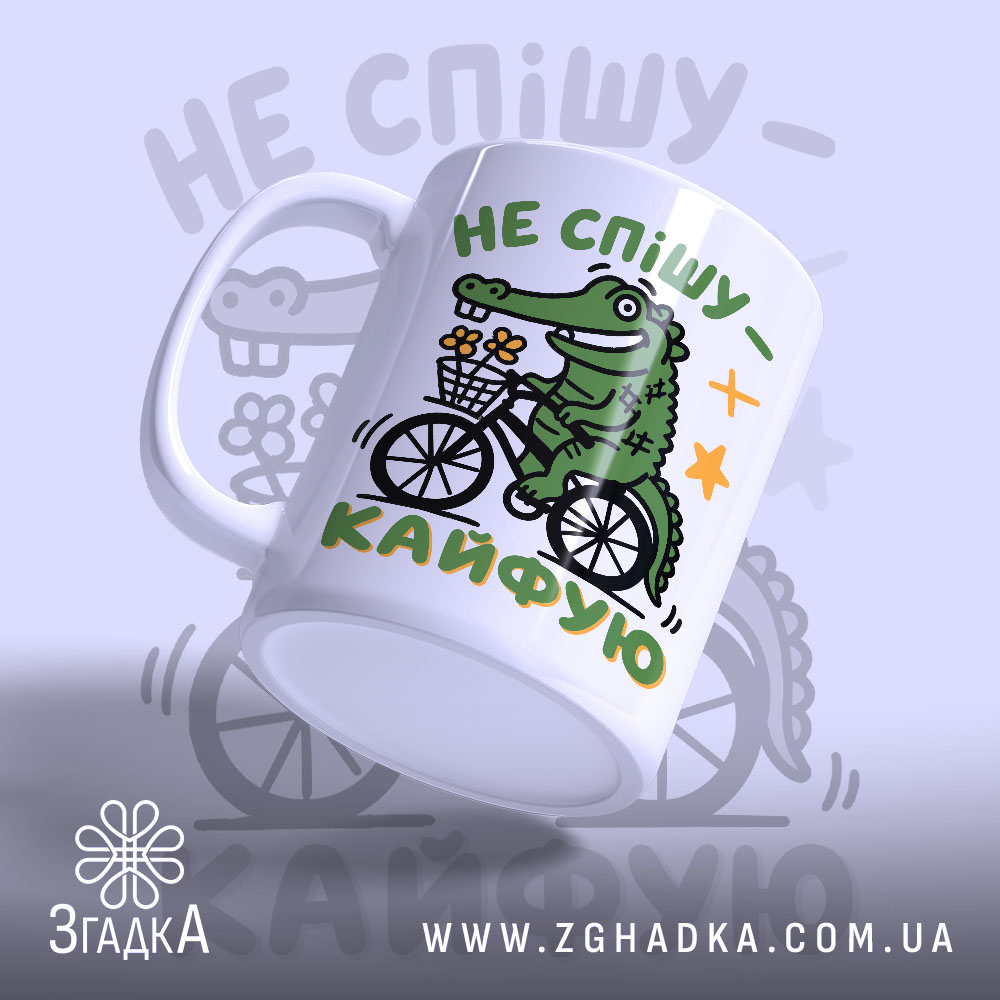 На чашці зображено веселого крокодила, що їде на велосипеді з букетом квітів у кошику. Яскраві кольори — зелений крокодил, білий фон та жовті зірочки створюють позитивний настрій. Напис ‘НЕ спішу — кайфую’ виконано у грайливому стилі, підкреслюючи легкість та радість.