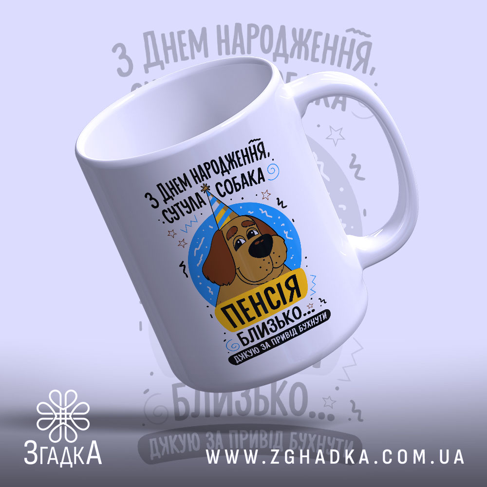 На чашці зображено веселу собаку в святковому капелюшку. Яскраві кольори, зокрема жовтий, блакитний та чорний, створюють позитивний настрій. Напис ‘ПЕНСІЯ БЛИЗЬКО’ виділяється великим шрифтом, підкреслюючи гумористичний контекст.
