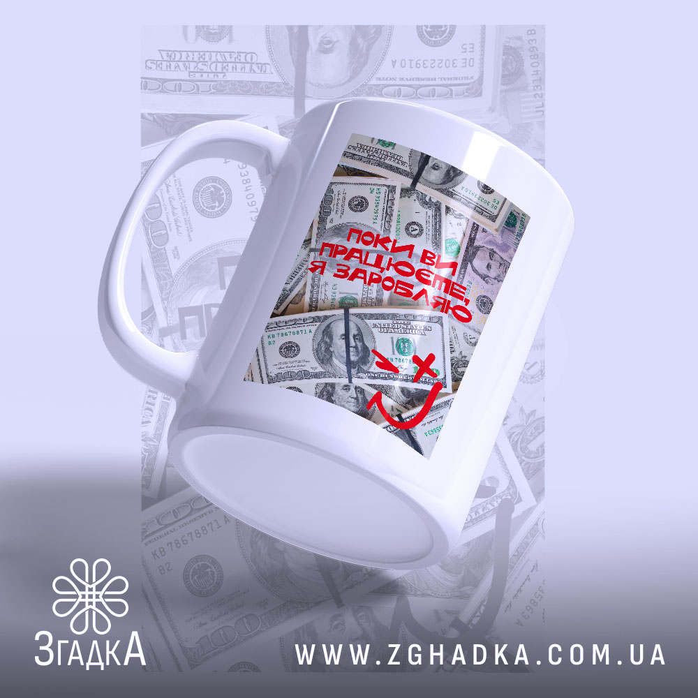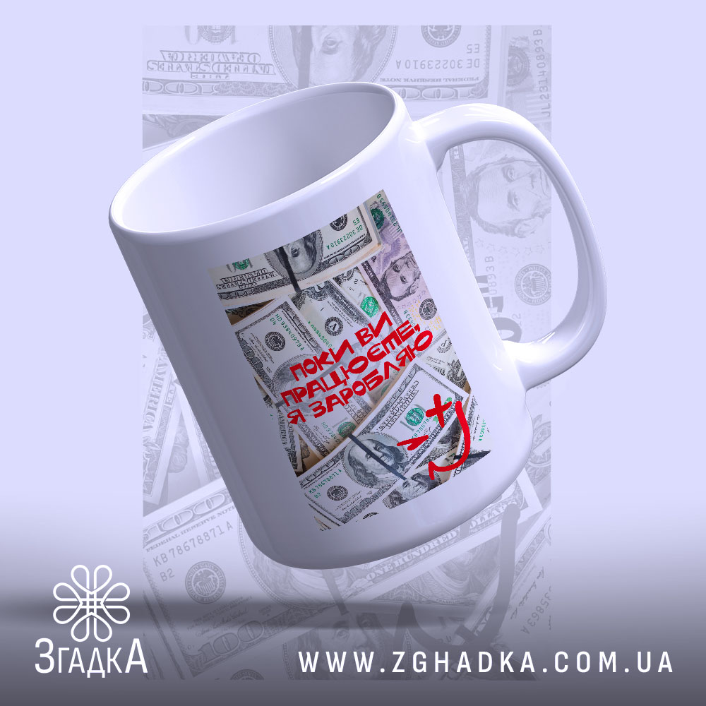 Яскравий принт з текстом, що викликає усмішку. На фоні зображення доларів, червоний напис ‘Поки ви працюєте, я заробляю’ привертає увагу. Стильний, сучасний, з елементами гумору — це не просто чашка, це настрій.