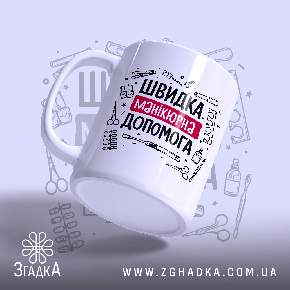 Яскравий принт з написом “ШВИДКА МАНІКЮРНА ДОПОМОГА” привертає увагу. Використані чорний та червоний кольори, що створюють контраст. Серед малюнків — інструменти для манікюру, які підкреслюють тематику. Це не просто чашка, а справжня заява для креативних людей.