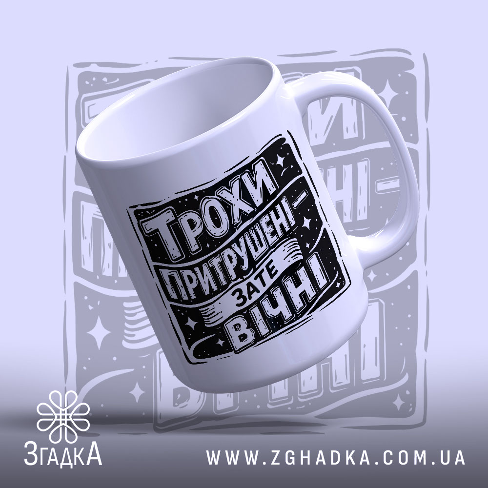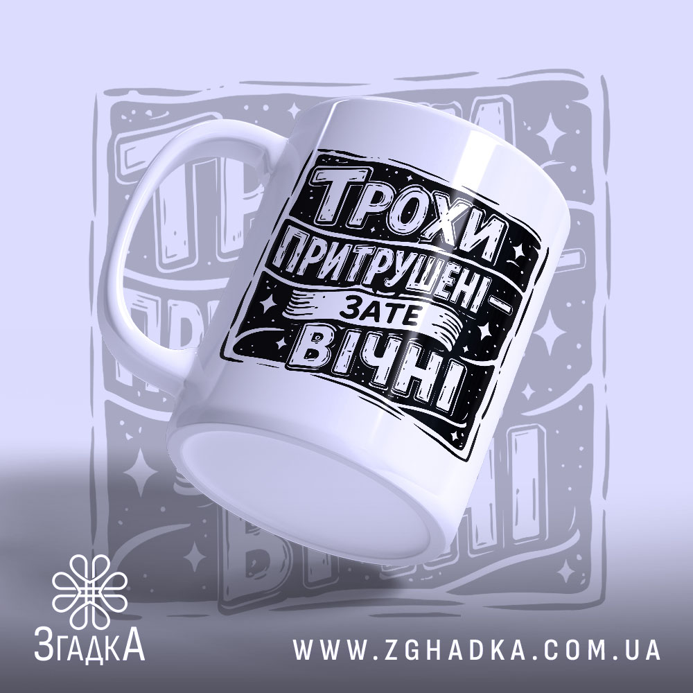 На чашці зображено яскравий напис ‘Трохи притрушені — зате вічні’, оформлений у стилі ретро. Чіткі контури та контрастні кольори створюють враження міцності та надійності. Декор доповнюють зірочки, що надають композиції динаміки та енергії.