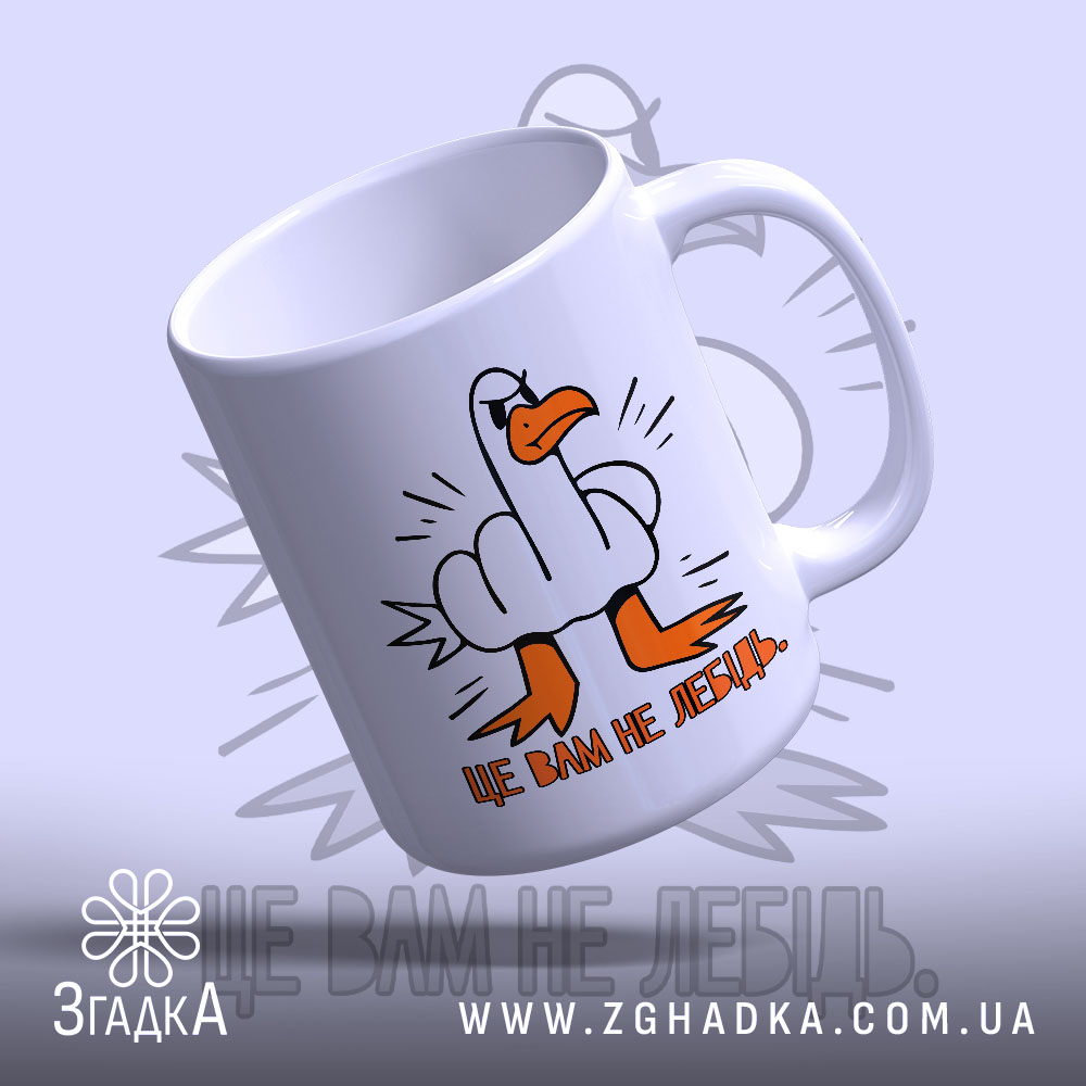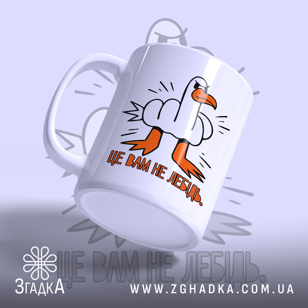 На чашці зображено кумедного птаха, що нагадує лебедя, але з виразом, який говорить: ‘ЦЕ ВАМ НЕ ЛЕБІДЬ’. Яскраві кольори, зокрема білий, оранжевий та чорний, створюють веселий настрій. Стиль малюнка — сучасний, з елементами коміксів, що привертає увагу.