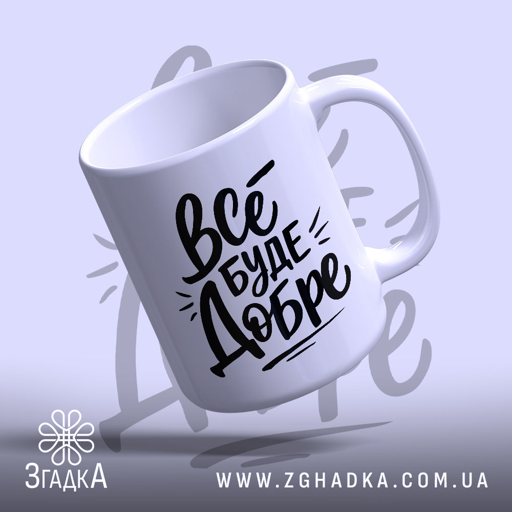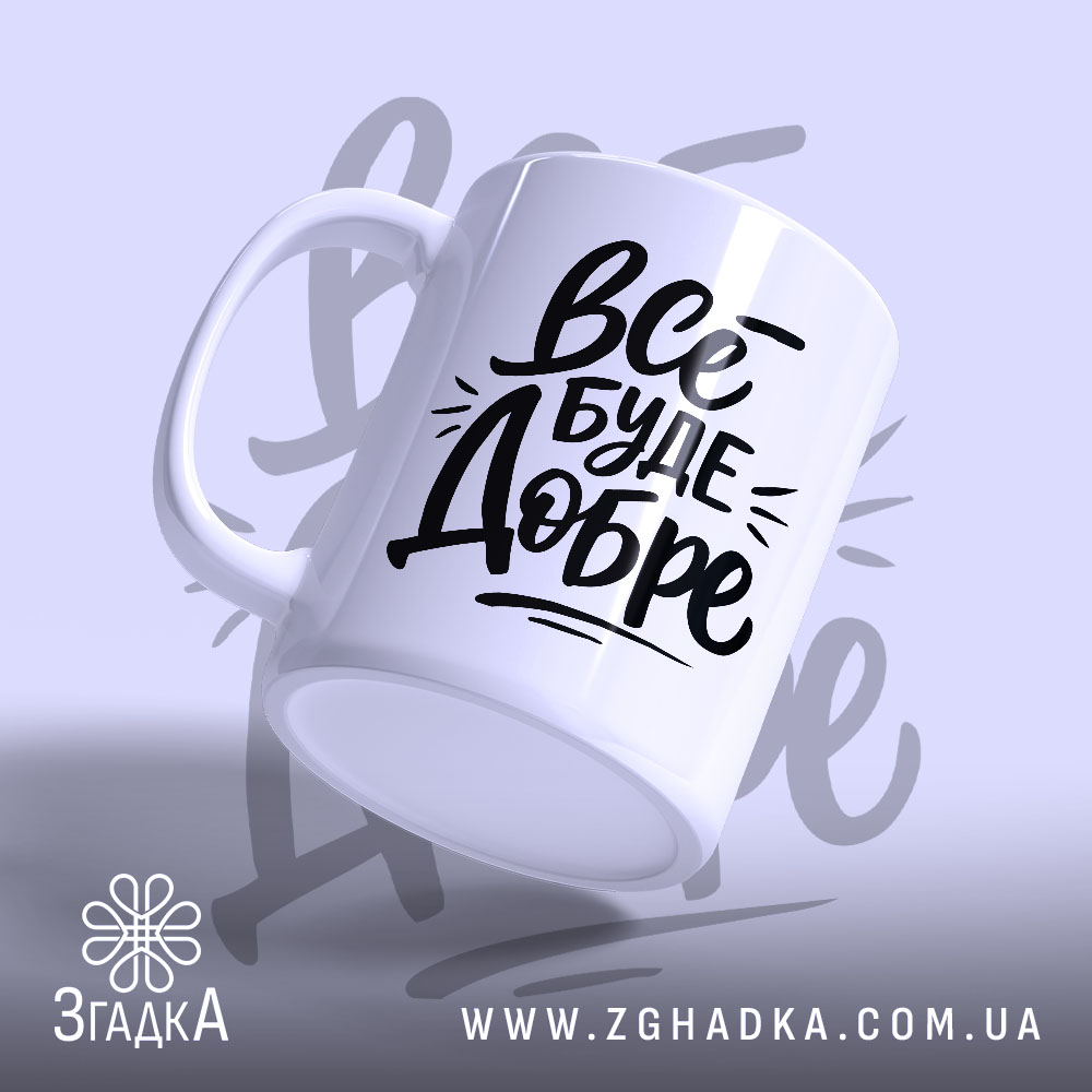 На чашці яскраво написано ‘Все буде добре’. Стильний шрифт, що передає оптимізм, доповнений динамічними елементами. Чорний текст на білому фоні створює контраст, що привертає увагу.