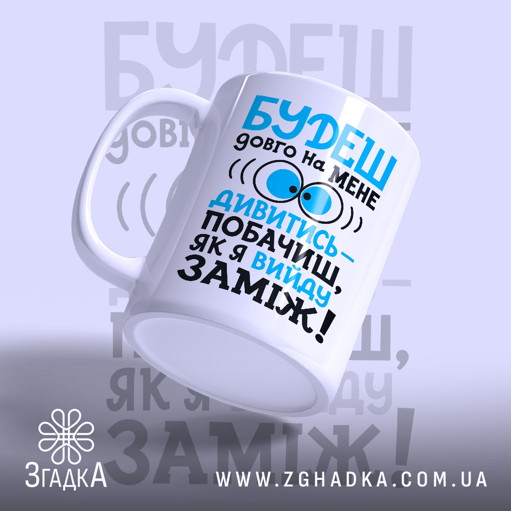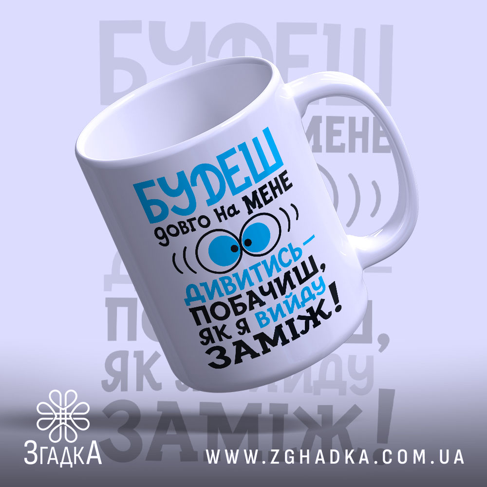 На чашці яскравий принт з веселим текстом: ‘БУДЕШ довго на МЕНЕ дивитися — побачиш, як я вийду ЗАМІЖ!’ Стильний шрифт у поєднанні з великими очима створює грайливу атмосферу. Яскраві кольори синього та чорного привертають увагу та піднімають настрій.