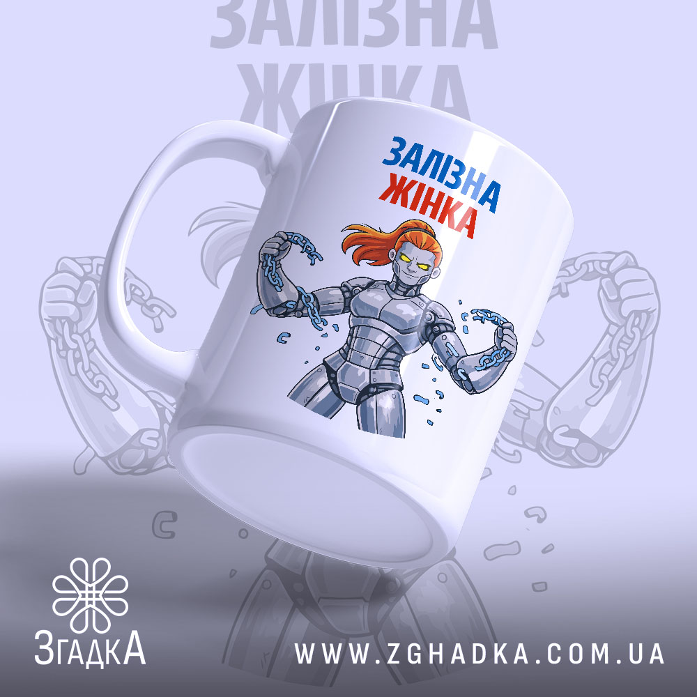 На чашці зображено 'залізна жінка' — символ сили та впевненості. Замовте свою чашку зараз і додайте яскравий акцент у ваше життя!