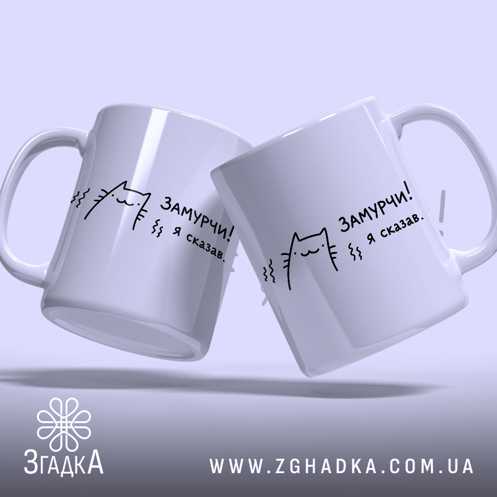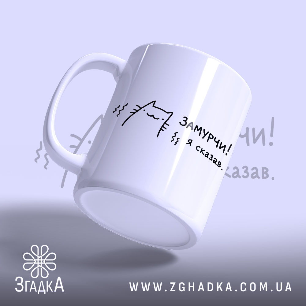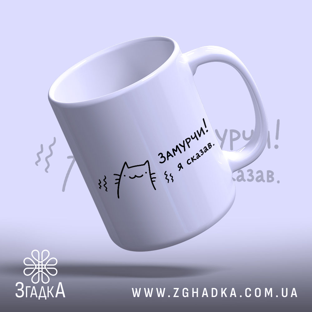 На чашці зображено милий котик, що злегка усміхається, з текстом ‘Замурчи! Я сказав.’ у веселому шрифті. Чорний контур на білому фоні створює яскравий контраст, підкреслюючи простоту та грайливість дизайну. Цей принт точно підніме настрій!