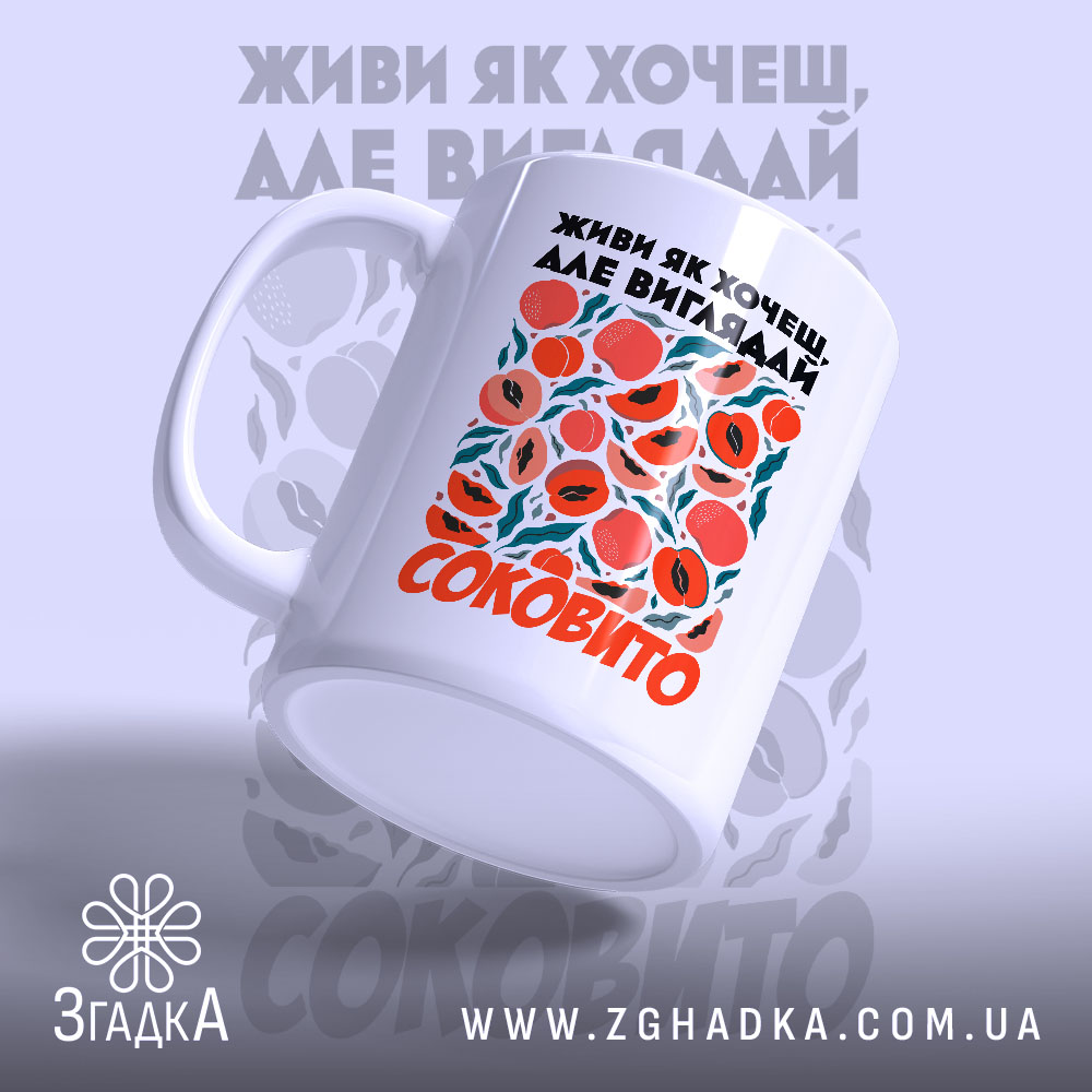 Яскравий принт, що закликає до життя на повну. На чашці зображено фразу ‘Живи як хочеш, але виглядай соковито’ на фоні фруктових мотивів. Яскраві кольори, що поєднують червоний, зелений та чорний, створюють енергійний настрій.