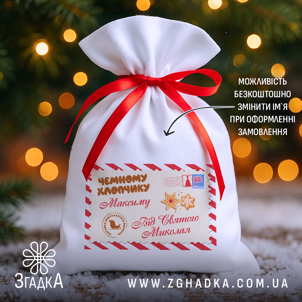 Дитячий подарунковий мішечок — це символ тепла, добра і святкового настрою. Його дизайн у вигляді конверта “Від Святого Миколая” викликає асоціації з дитячою радістю, очікуванням подарунків і магією передноворічної ночі. Усередині можна сховати будь-який сюрприз — від солодощів до невеликих іграшок. А персоналізований напис додає відчуття, що цей подарунок справді надійшов із небесної пошти!