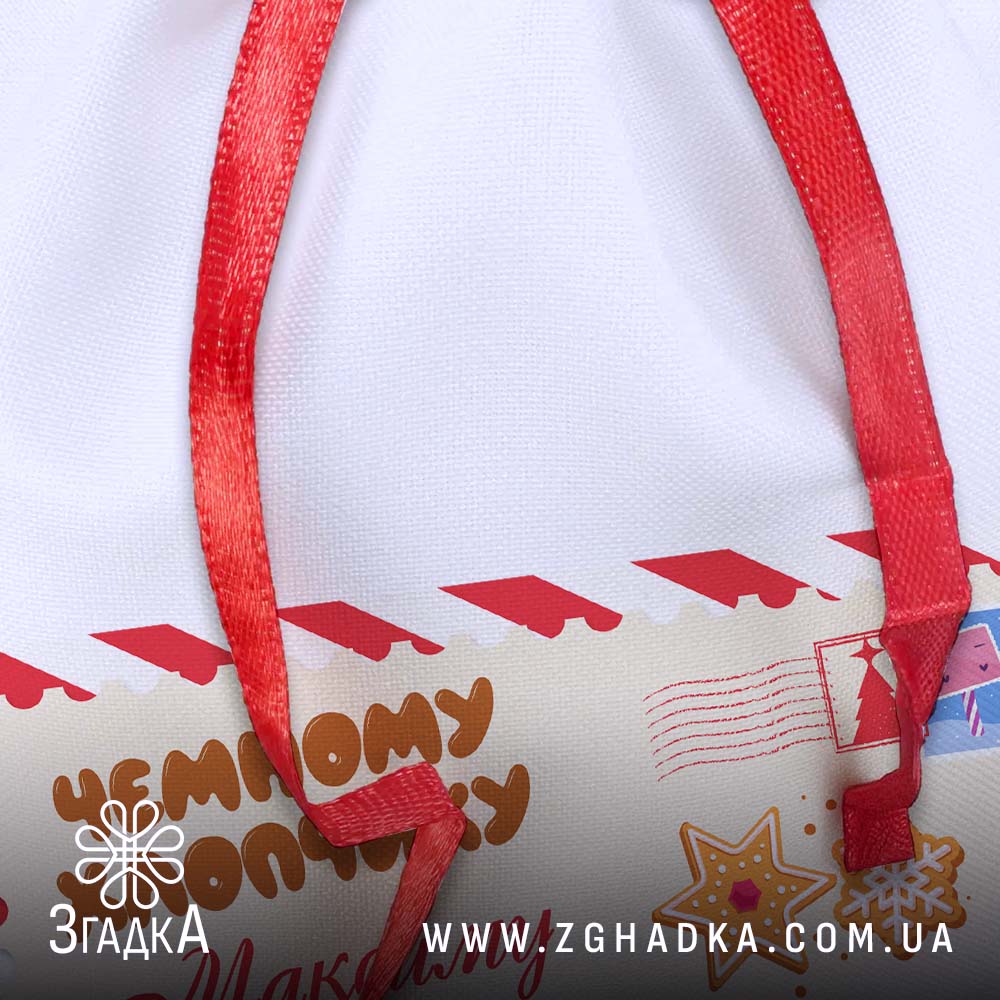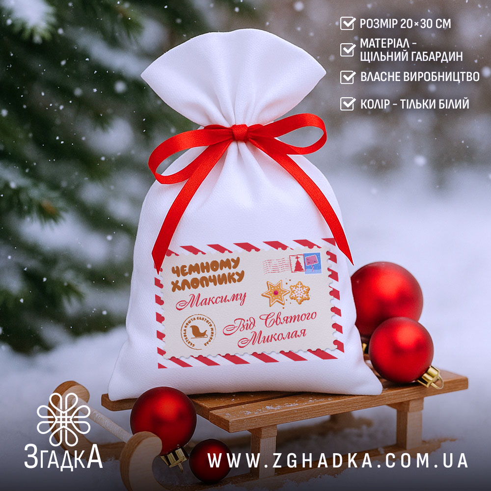 Мішечок виготовлений з якісного щільного габардину розміром 20×30 см. Білий колір основи чудово підкреслює яскравість червоної атласної стрічки, створюючи ефект акуратності й святковості. Завдяки міцному матеріалу мішечок можна використовувати не один рік, роблячи його частиною родинних святкових традицій. Персоналізований напис виконується українською мовою, а ім’я дитини додається безкоштовно.