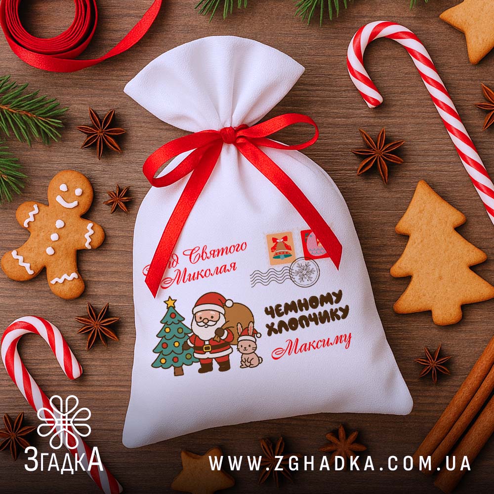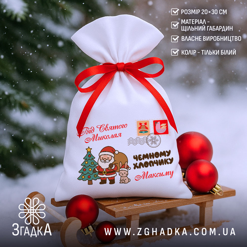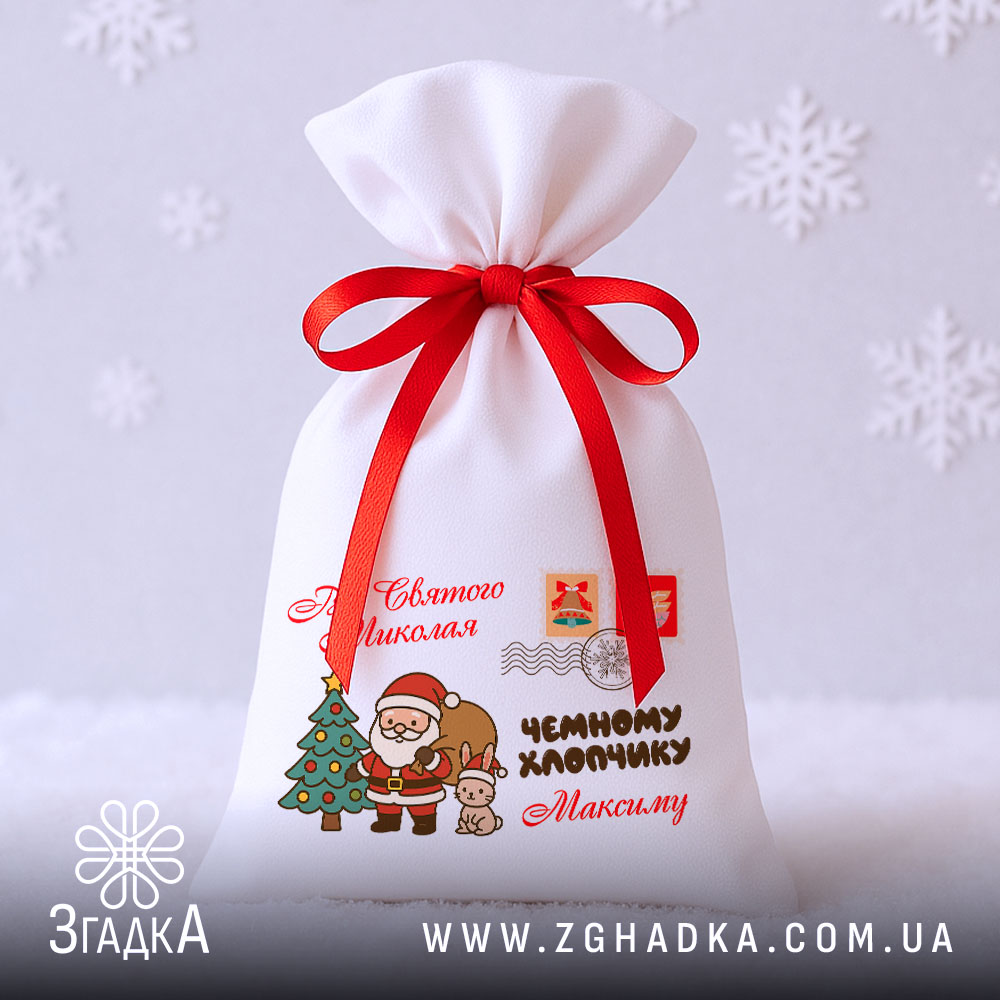 Таке паковання робить будь-який подарунок особливим. Діти із захопленням шукають своє ім’я на мішечку, а батьки насолоджуються їхньою радістю. Виготовлення займає лише 1–3 робочі дні, тож встигніть замовити свій мішечок заздалегідь. Колір доступний тільки білий — чистий, святковий і універсальний для будь-якого дизайну.