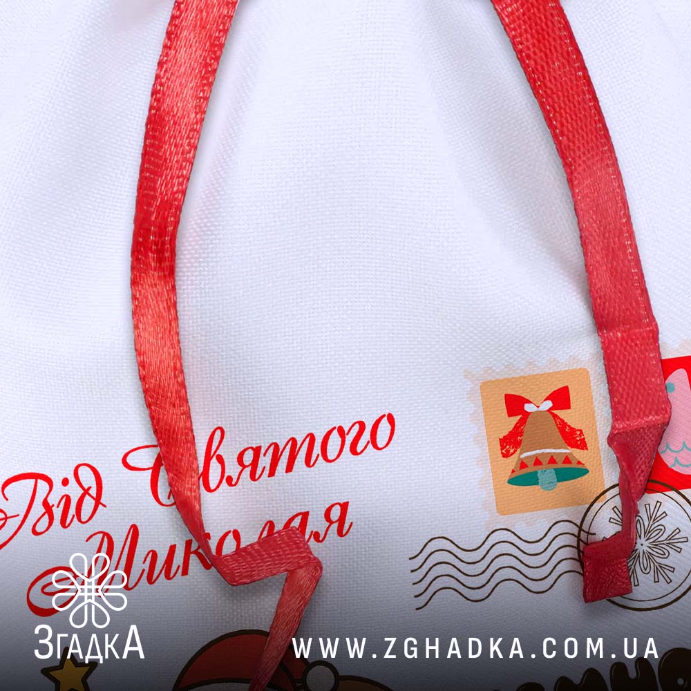 Мішечок виготовлено з щільного білого габардину, який не просвічується й тримає форму. Розмір 20×30 см — ідеальний для солодощів, іграшок чи невеликих сюрпризів. Червона атласна стрічка надає виробу завершеного вигляду, роблячи його по-справжньому святковим. Завдяки якості тканини мішечок можна використовувати не один рік поспіль, створюючи власну родинну традицію.