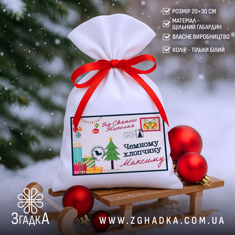 У студії Згадка кожен виріб виготовляється з увагою до деталей. Ви можете замовити персоналізацію без додаткової оплати — просто вкажіть ім’я дитини при оформленні. Виготовлення займає 1–3 робочі дні, тому встигніть підготувати свої подарунки заздалегідь! Колір мішечка — лише білий, що підкреслює чистоту й святковість дизайну.