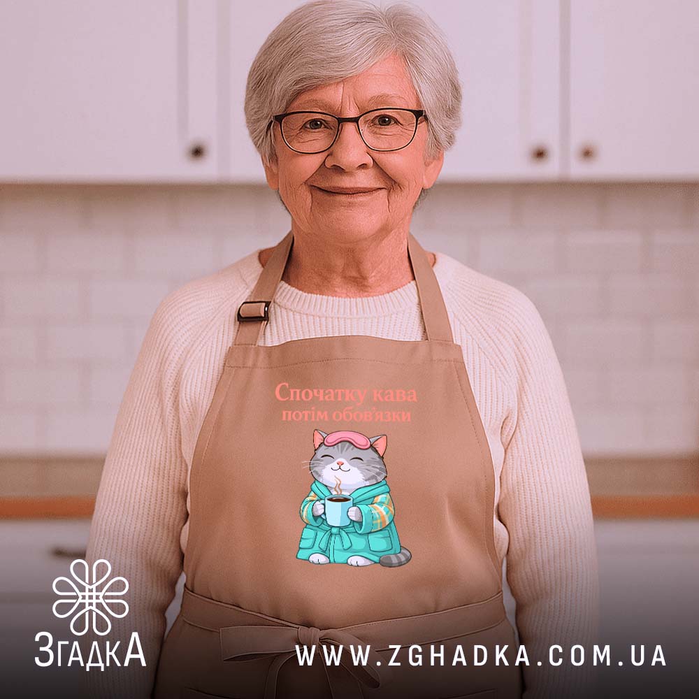 Фартух ‘Спочатку кава, потім обов’язки’ – це стильний та практичний аксесуар, який додасть позитиву у ваше повсякдення.