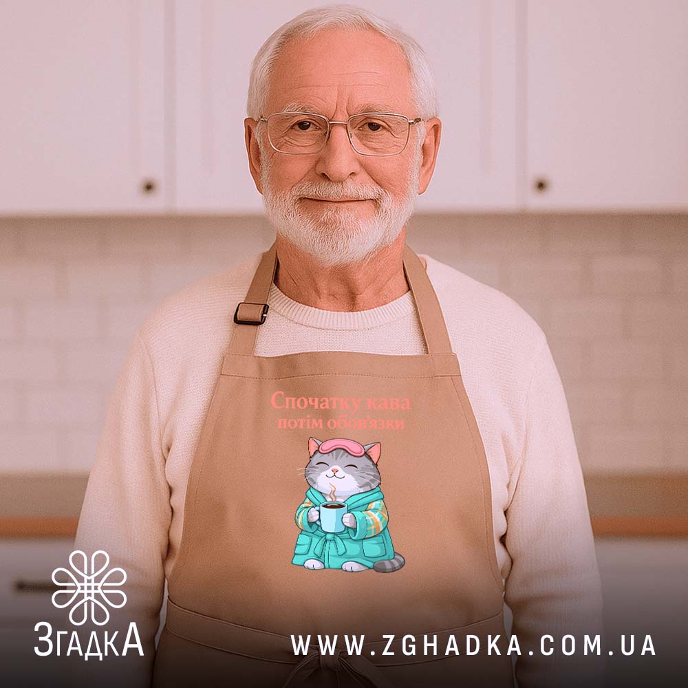 Фартух з принтом ‘Спочатку кава, потім обов’язки’ – ідеальний вибір для кухні та майстерні. Міцний, стильний та зручний у використанні.