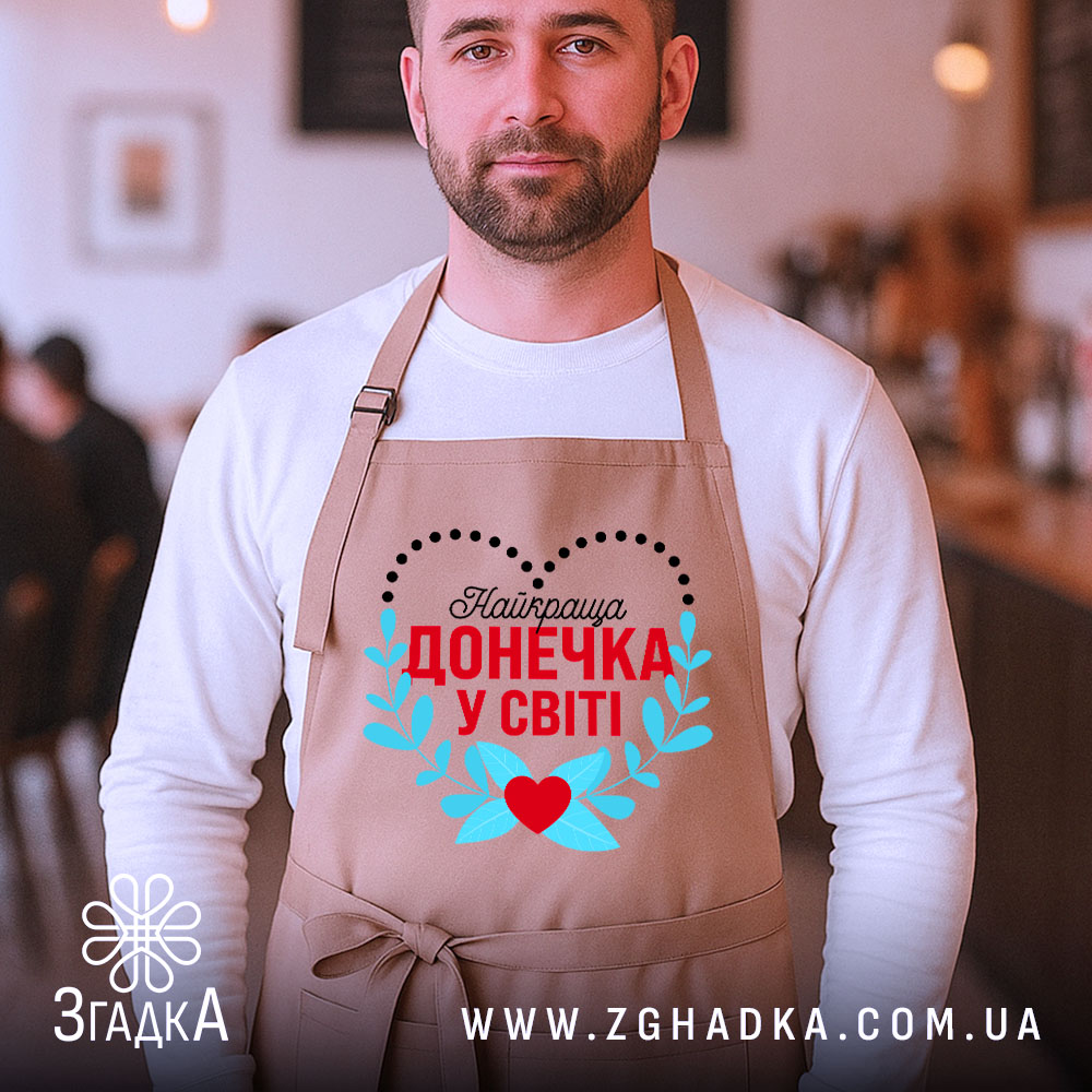 Фартух для донечки — це милий і стильний аксесуар для маленької господині. Унікальний дизайн із принтом «Найкраща донечка у світі» дарує тепло, радість і гарний настрій під час приготування улюблених страв.