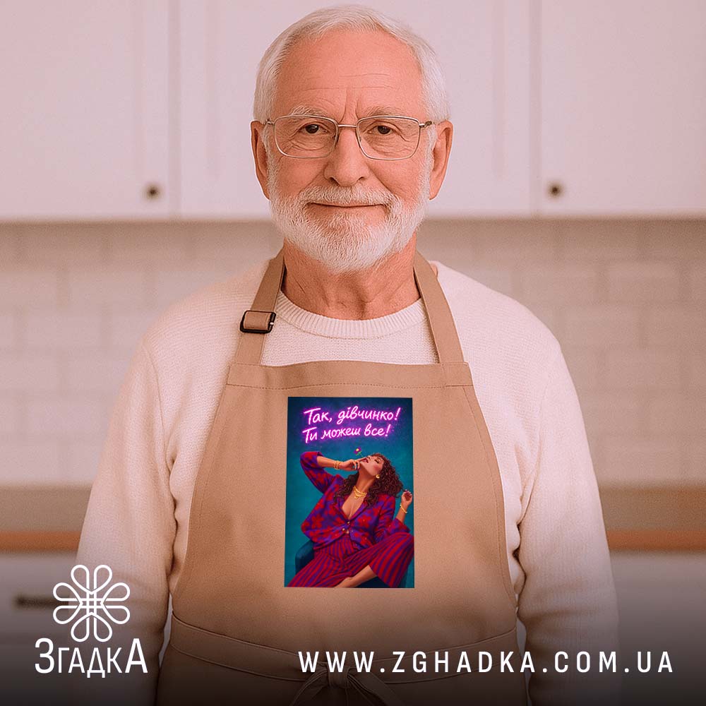 Наш фартух прикрашений унікальним принтом, що відображає силу та впевненість сучасної жінки. Він стане чудовим доповненням до вашого стилю на кухні чи в майстерні.