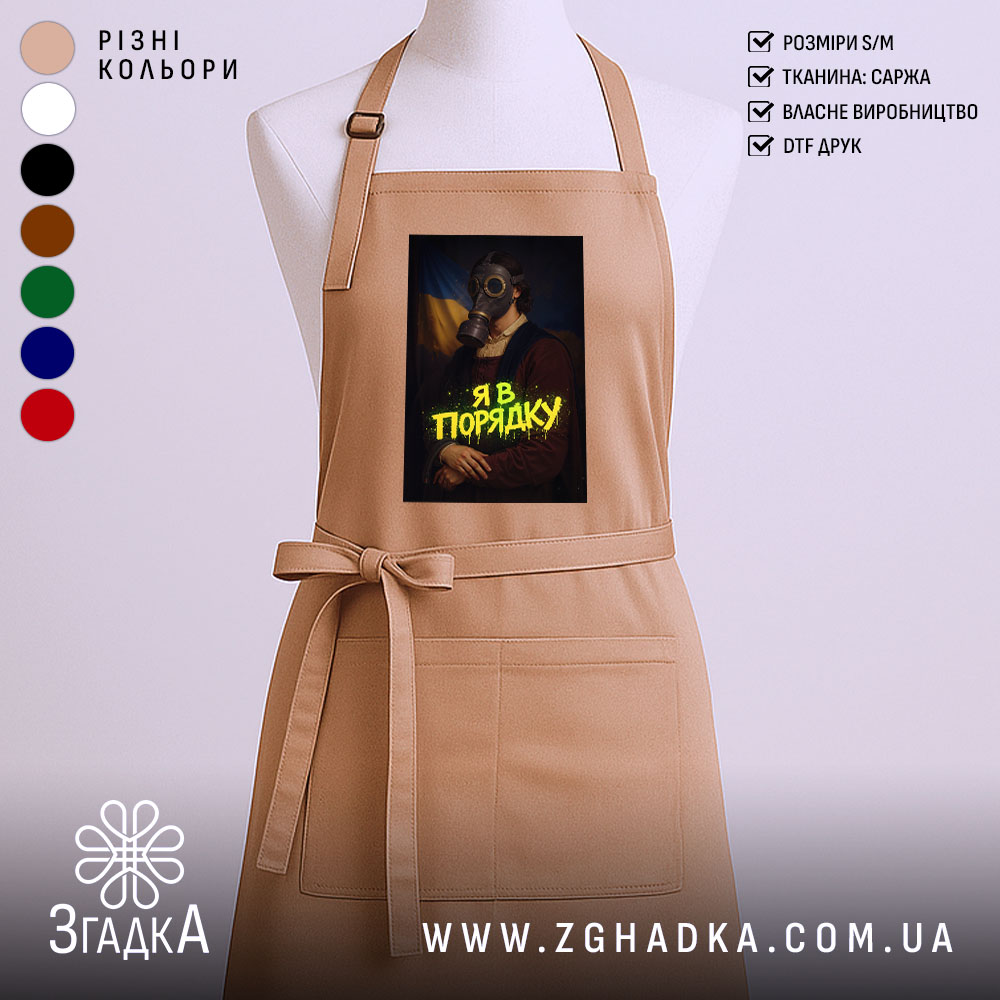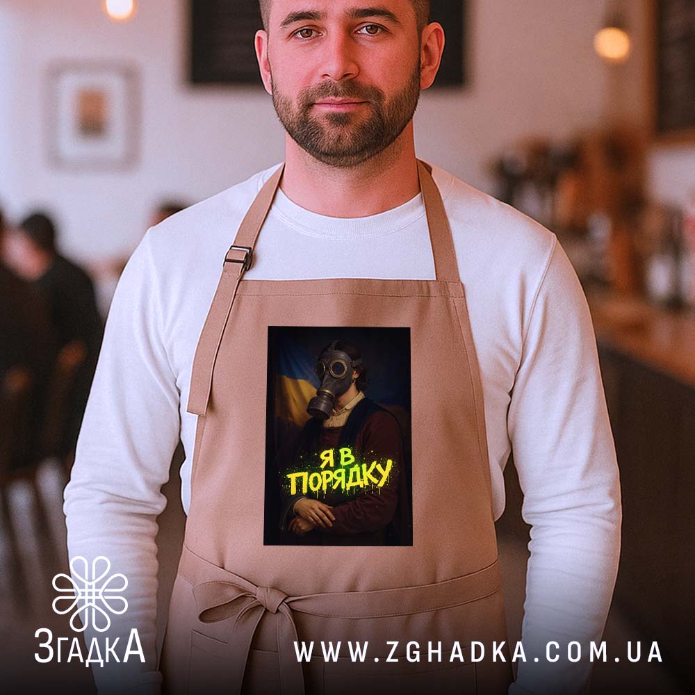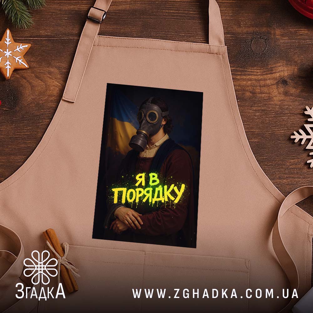 Фартух з оригінальним принтом ‘Я в порядку’ для кухні та майстерні. Міцний, комфортний і легкий у догляді.