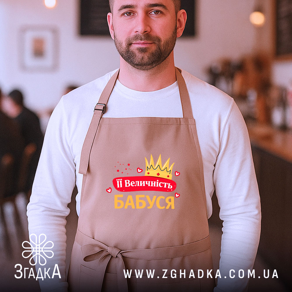 Фартух її величність бабуся – це стильний та практичний аксесуар для кухні. Він ідеально підходить для кулінарії та творчих занять.