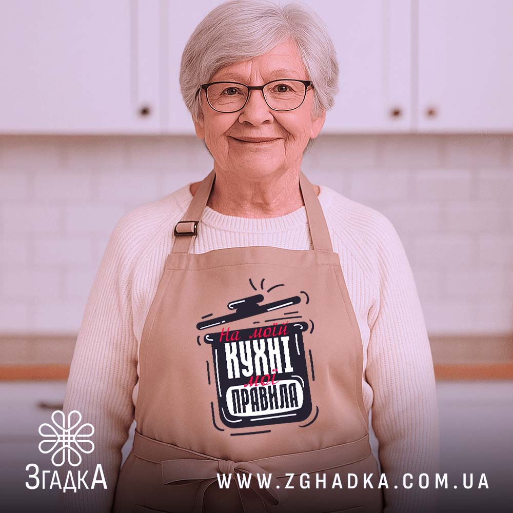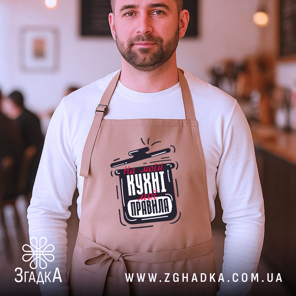 Фартух ‘Моя кухня правила’ — це не лише стильний аксесуар, але й практичний елемент, який зробить ваші кулінарні пригоди ще приємнішими.