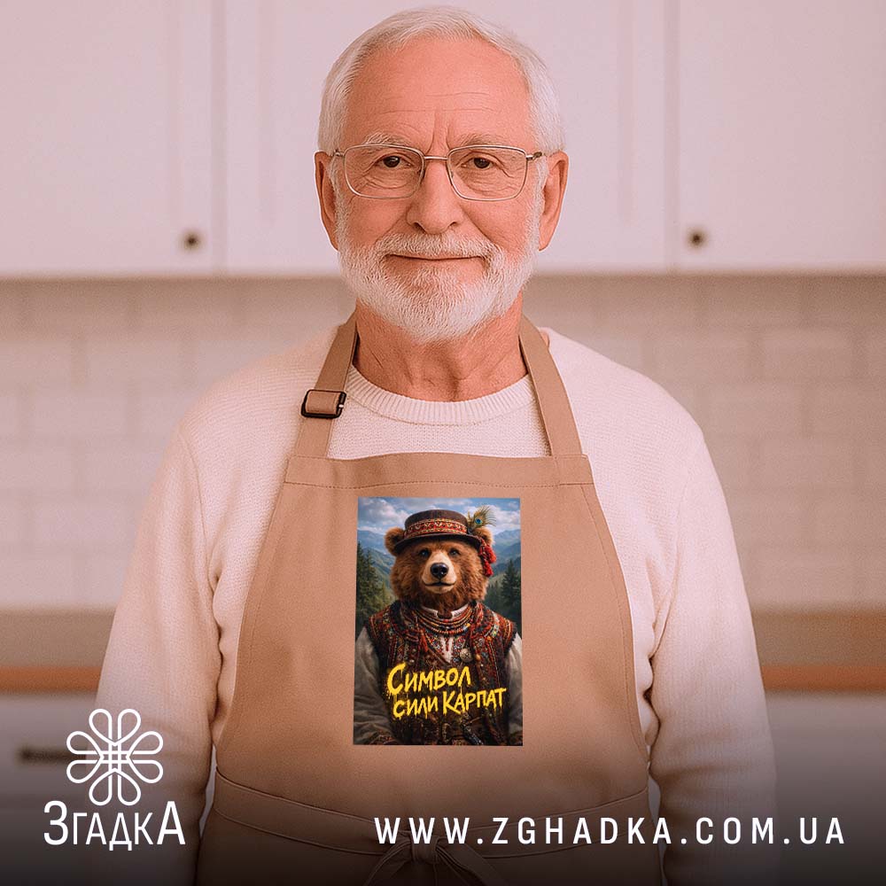 Фартух з принтом ведмедя – символ сили Карпат. Ідеальний для кухні, майстерні або як подарунок.