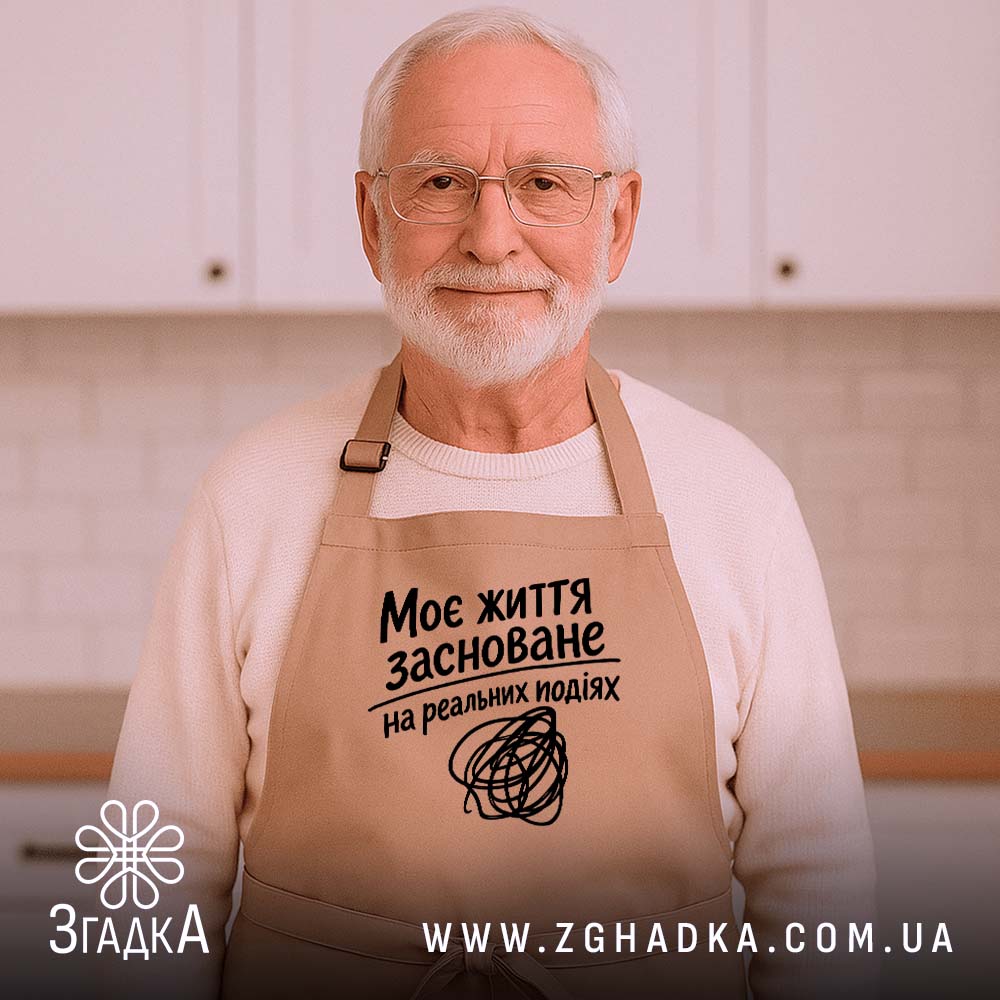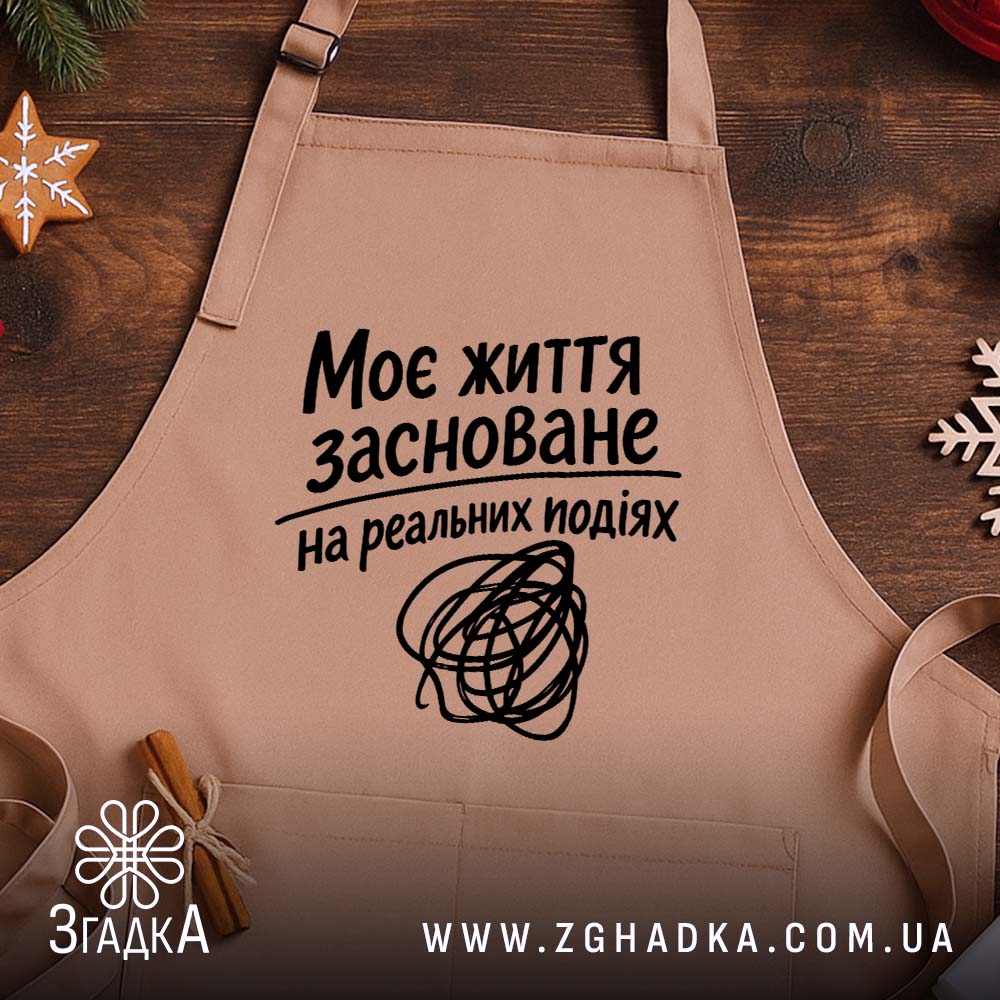 Яскравий принт, що говорить сам за себе. На фартусі зображено фразу: ‘Моє життя засноване на реальних подіях’, виконану в сміливому шрифті. Композиція доповнена абстрактним малюнком, що підкреслює креативність. Стиль – мінімалізм, що привертає увагу.