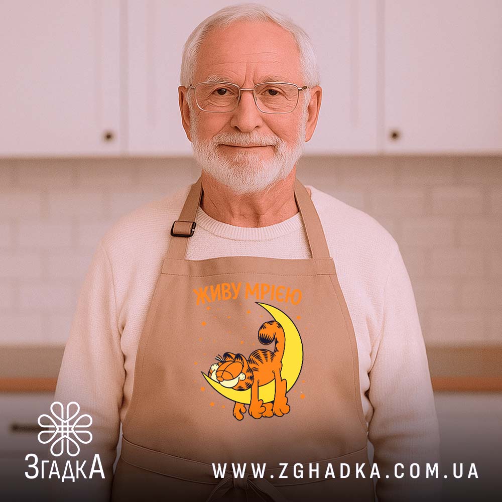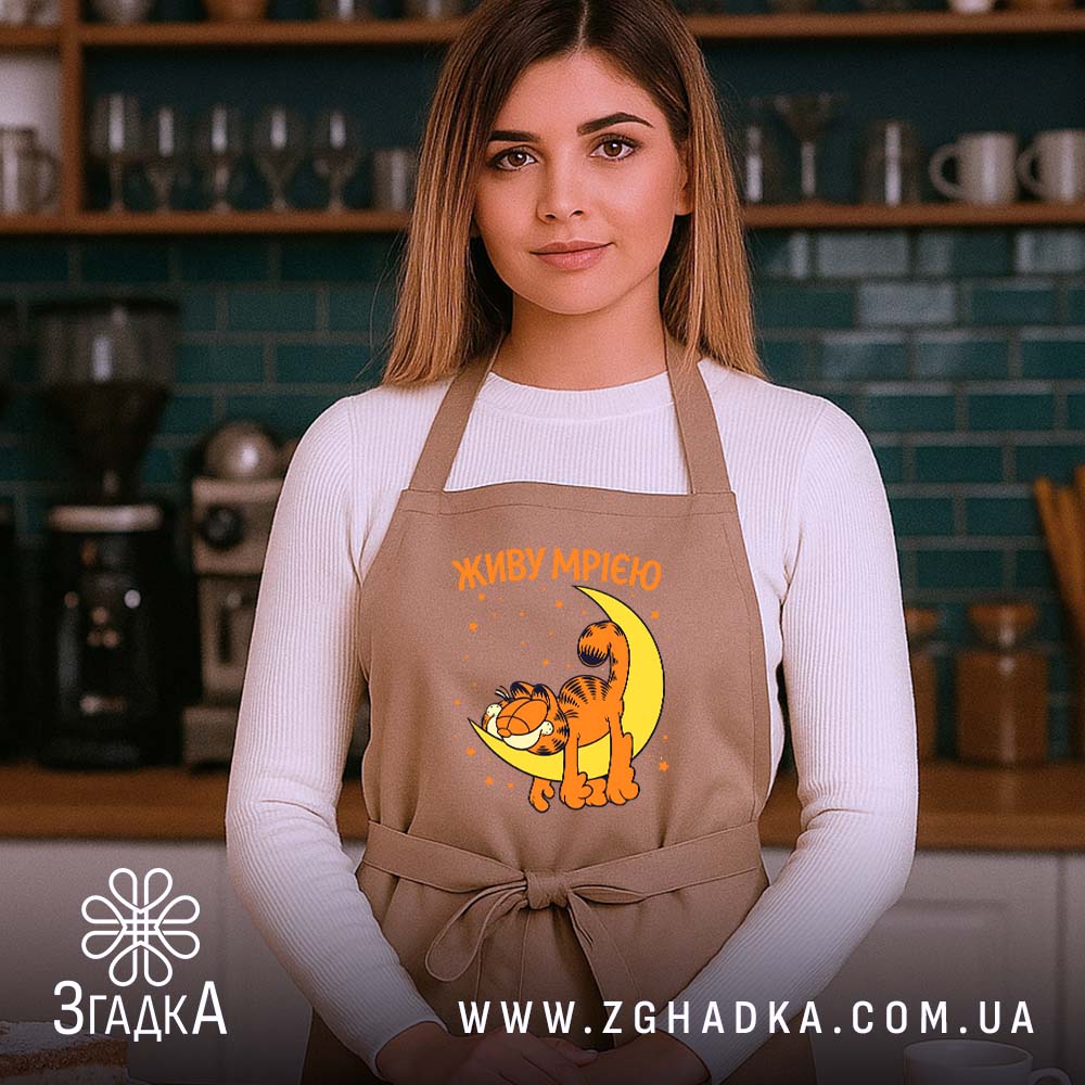 Яскравий принт з котом, що мріє на місяці, створює атмосферу затишку. Текст ‘ЖИВУ МРІЄЮ’ виконаний у веселих кольорах, підкреслюючи позитивний настрій. Композиція вражає простотою та емоційністю, що робить цей фартух справжнім витвором мистецтва.