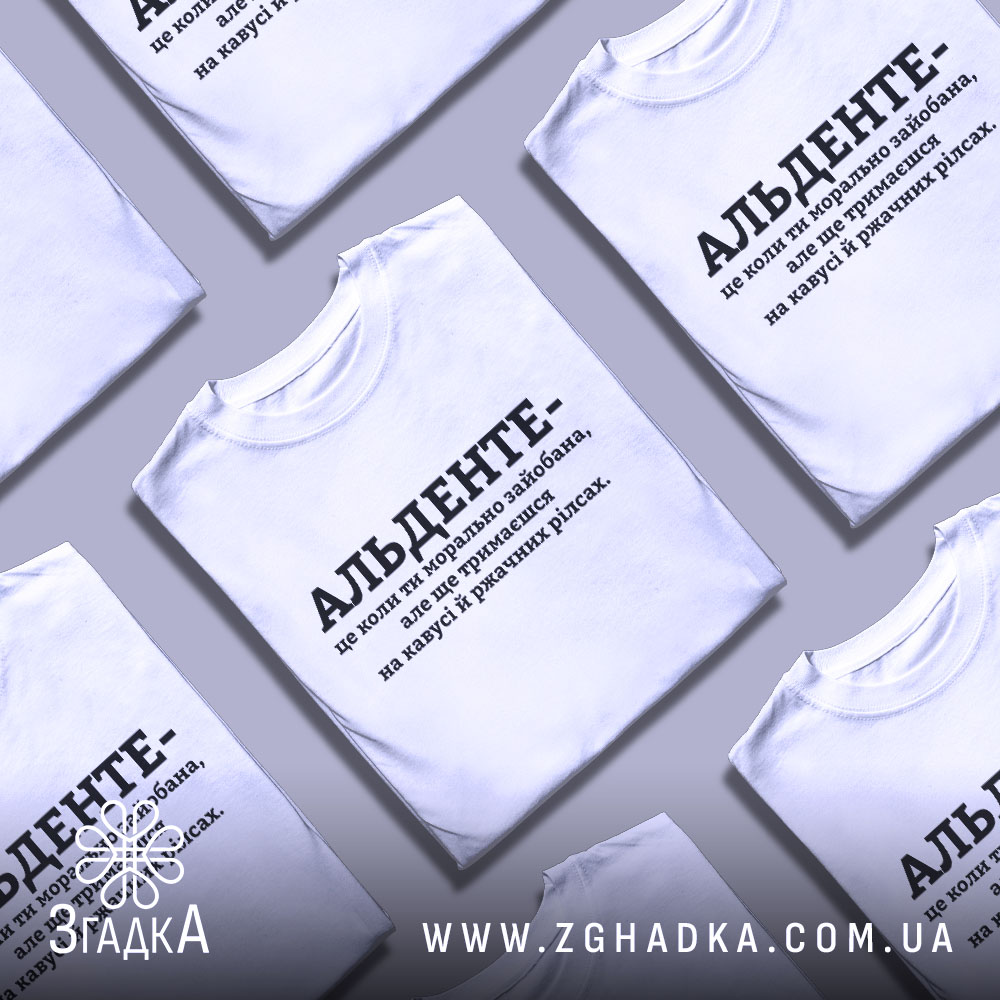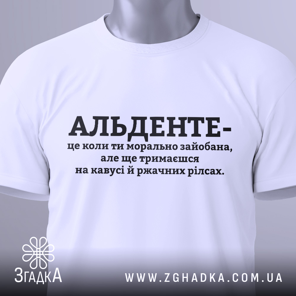 Футболка альденте – це стильний одяг з кумедним принтом. Вона ідеально підходить для будь-якої нагоди.