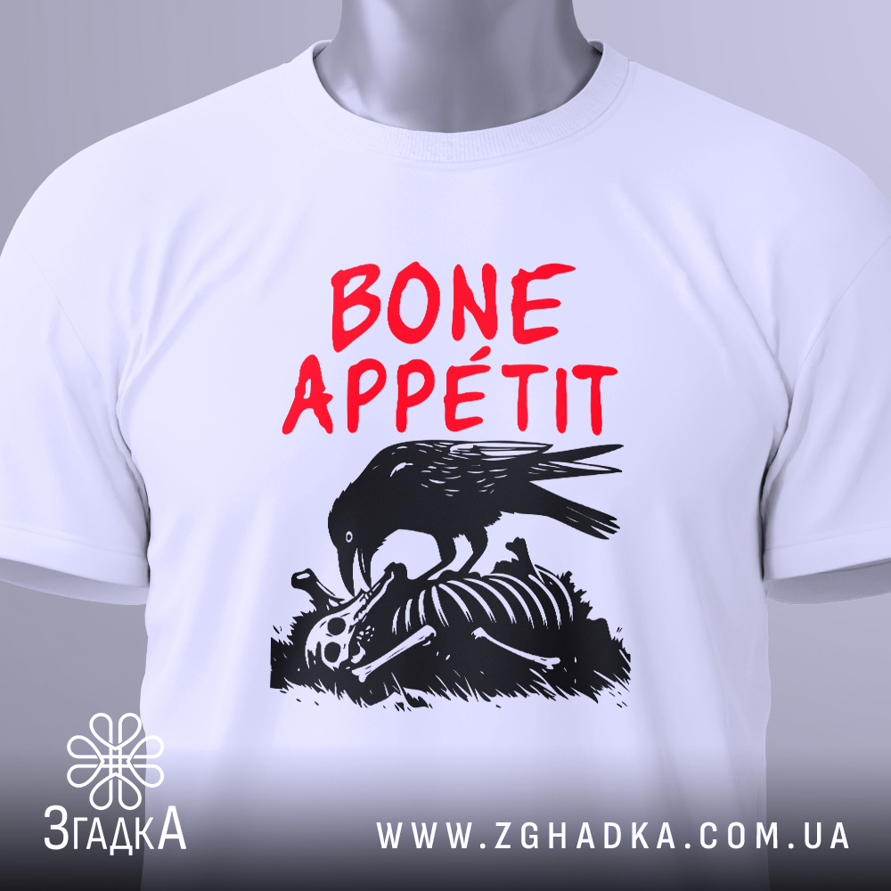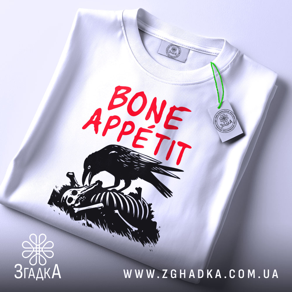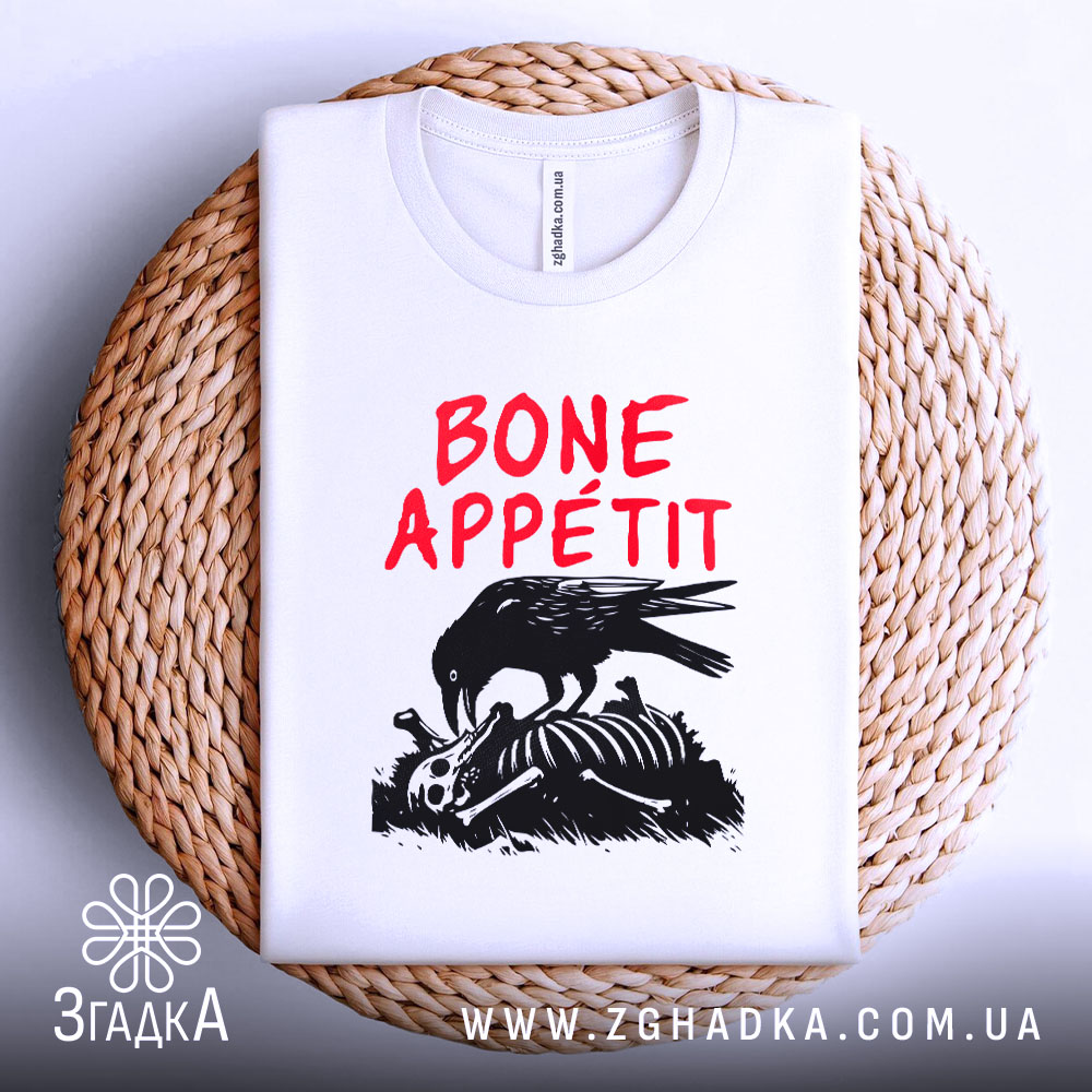 На принті зображено кумедний напис ‘Bone Appétit’, що викликає усмішку та підкреслює ваш унікальний стиль. Ідеальний вибір для любителів гумору та оригінальності! Замовляйте зараз!