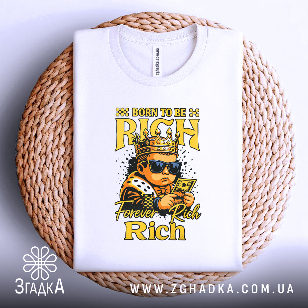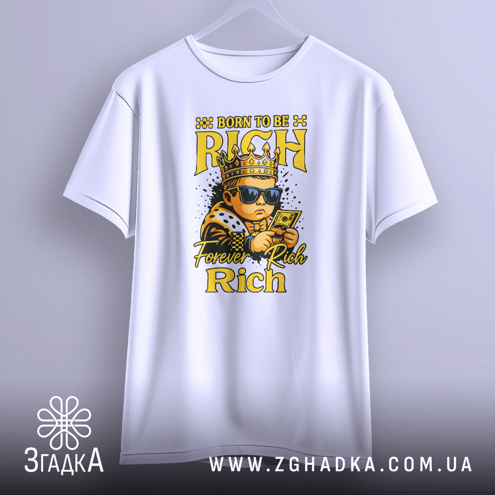 Ця футболка з принтом ‘born to rich’ відображає впевненість та стиль. Вона стане чудовим доповненням до вашого гардеробу. Відчуйте себе особливим!