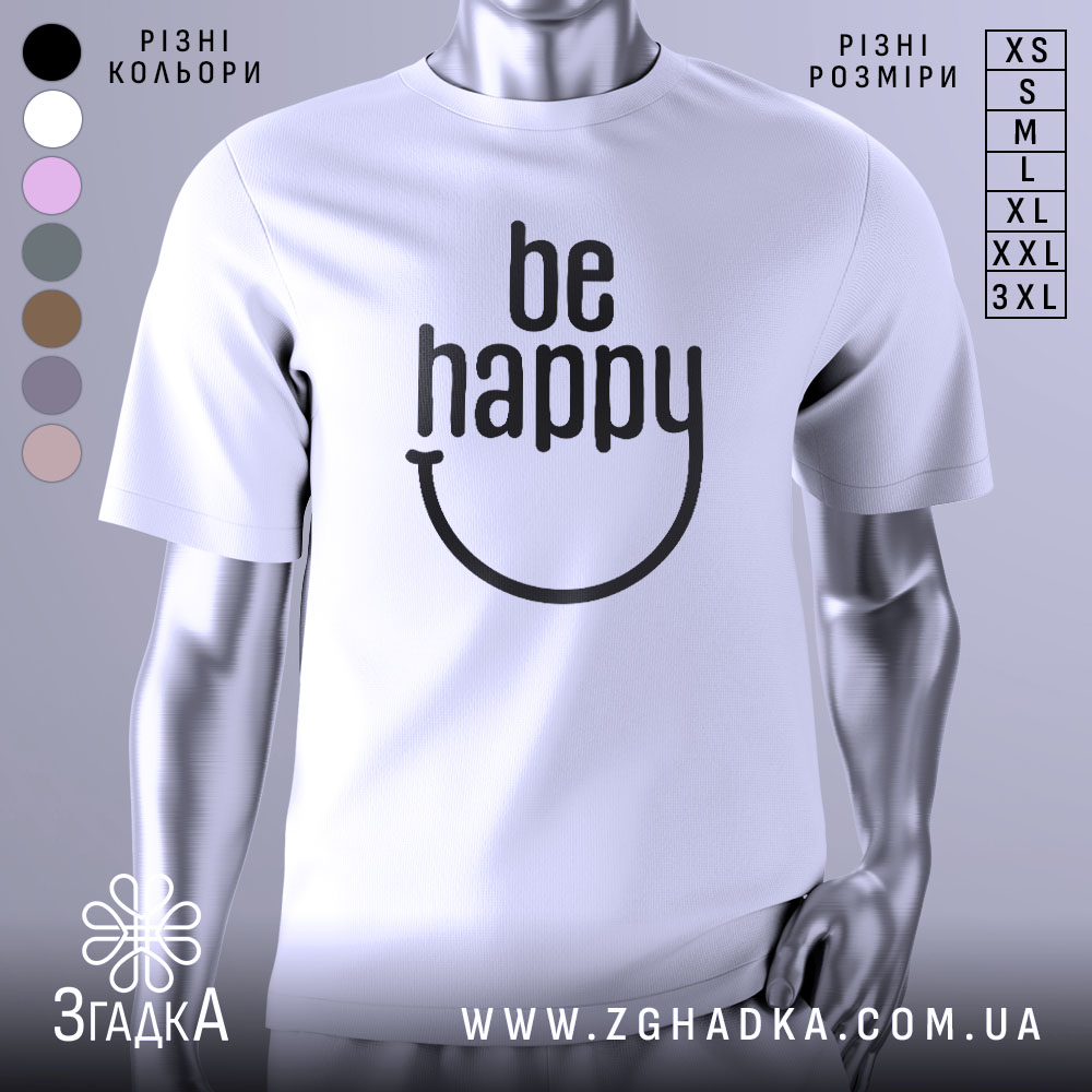 Футболка ‘будь щасливим’ – це стильний вибір для кожного дня. Яскравий принт надихає на позитивні емоції.