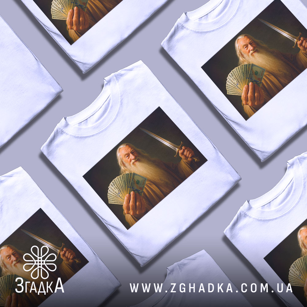 Футболка чарівник з доларами – це не просто одяг, а символ удачі та фінансового благополуччя. Принт з чарівником, що оточений доларами, надихає на досягнення нових вершин та втілення мрій у реальність.