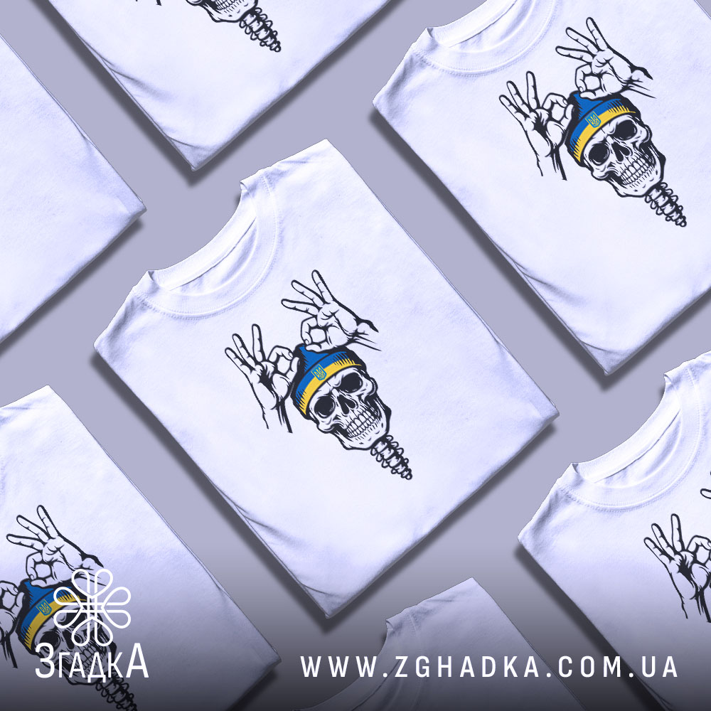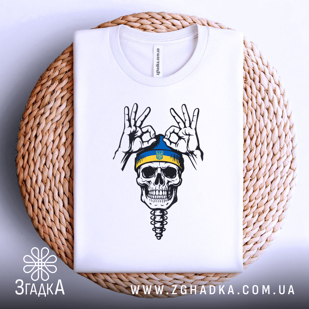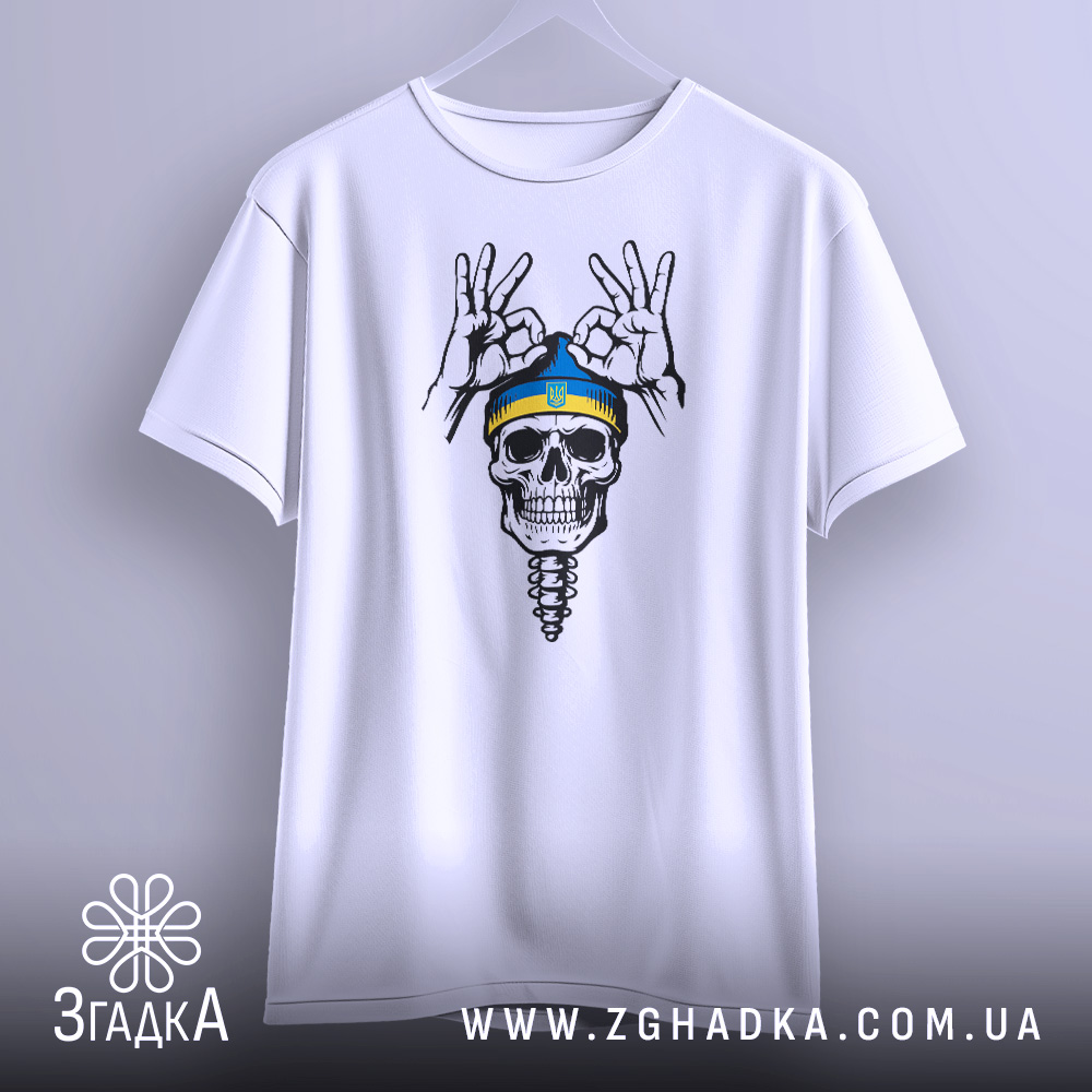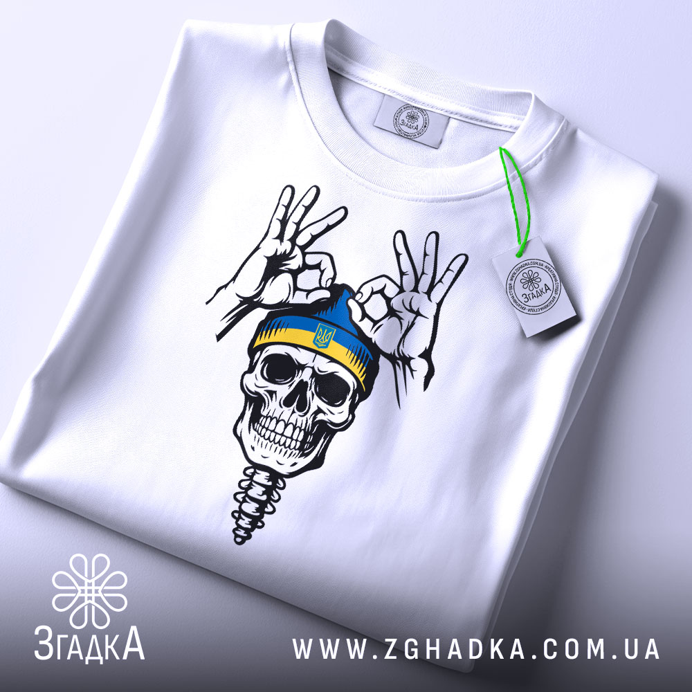 На принті зображено потужний череп воїна, що символізує силу та відвагу. Ця футболка стане яскравим акцентом у вашому гардеробі. Відчуйте себе впевнено та стильно!