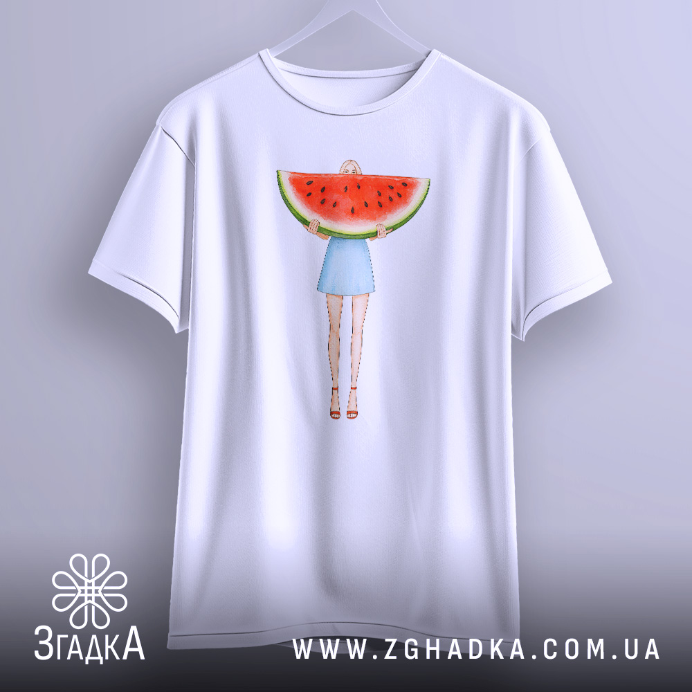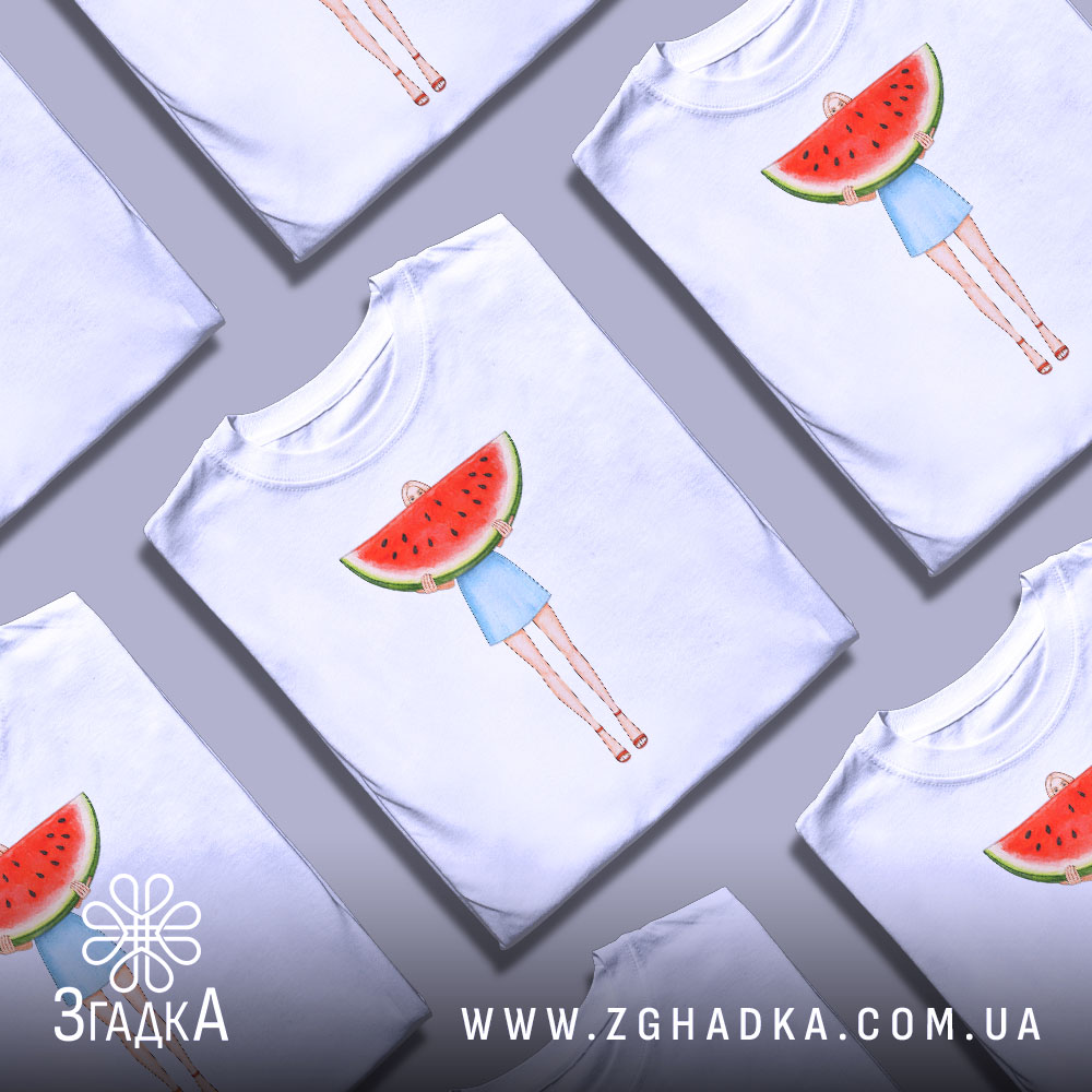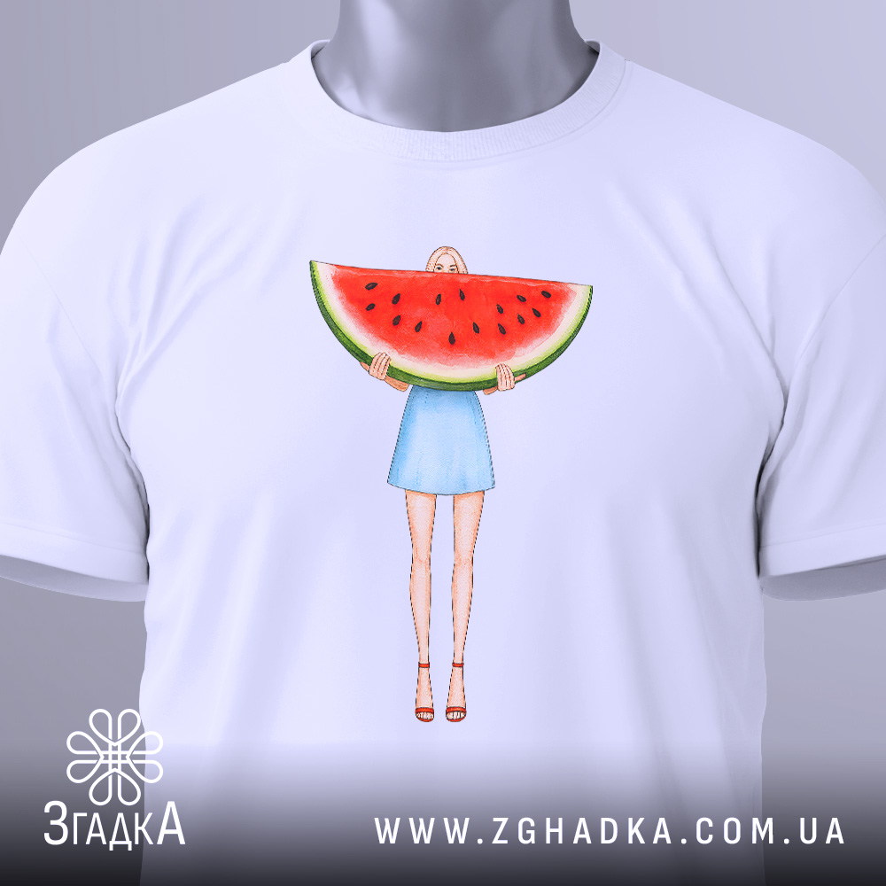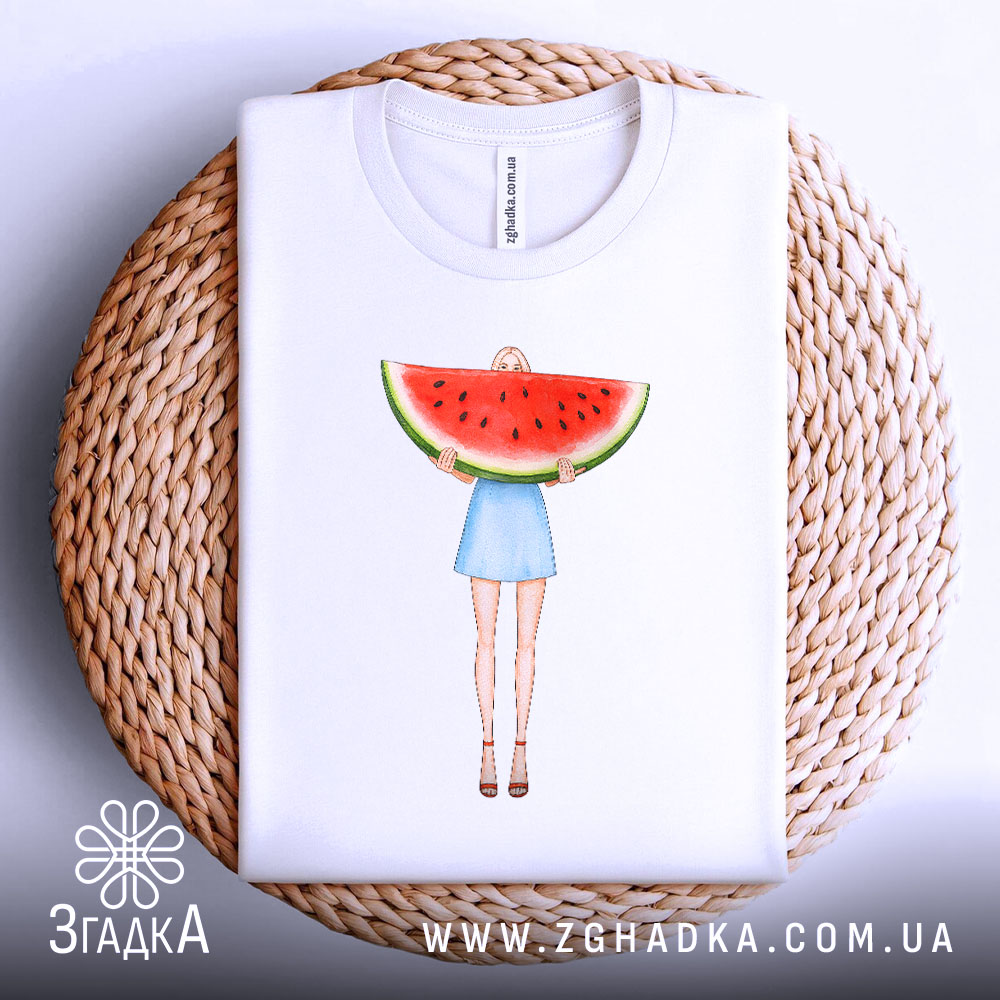 Футболка дівчина кавун – стильний вибір для літа. Яскравий принт і комфортний матеріал зроблять ваш образ незабутнім.