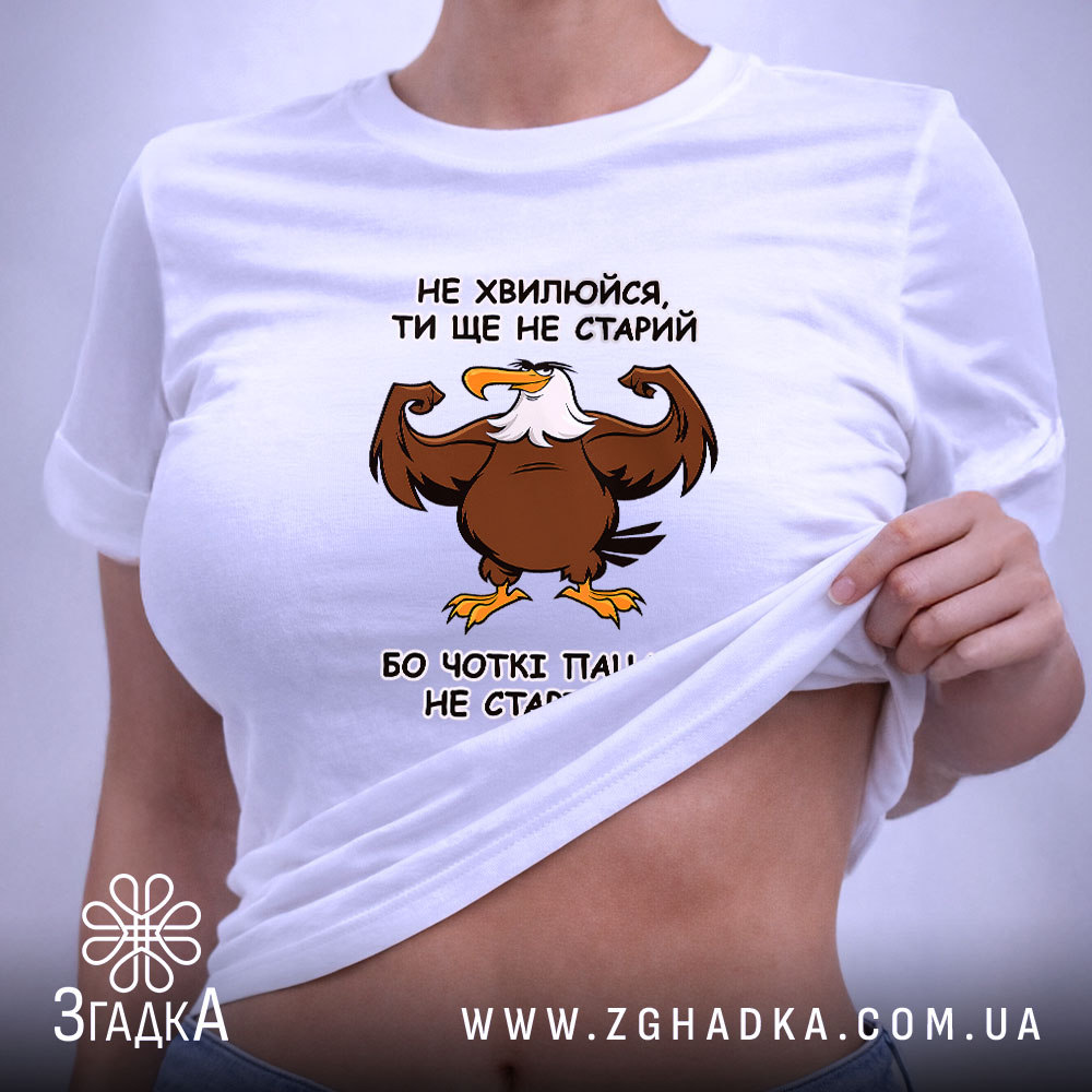 Сміливий принт з зображенням орла, що демонструє силу та впевненість. Яскраві кольори: коричневий, білий, жовтий. Текст, що закликає не хвилюватись, виглядає як потужна заява про молодість і енергію.
