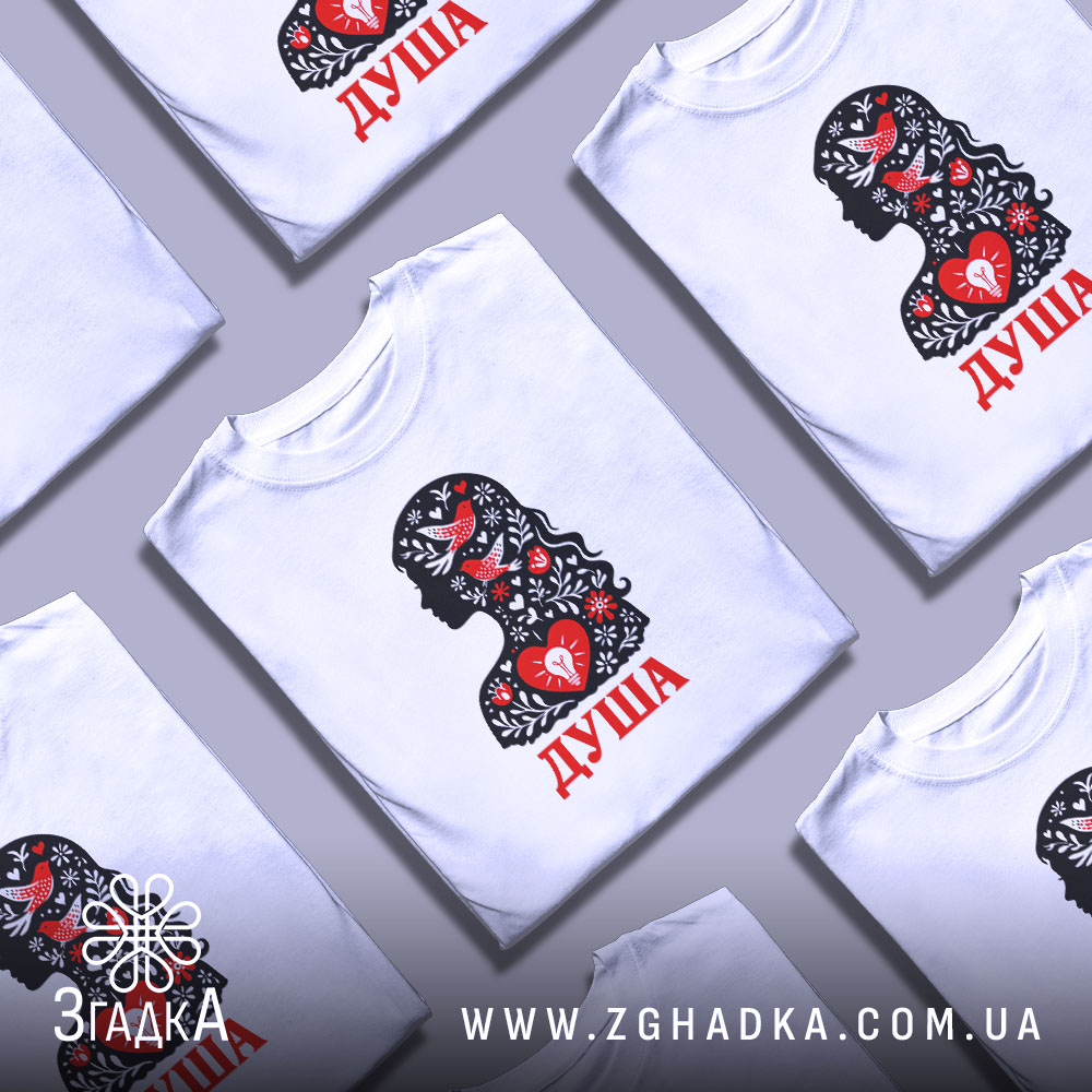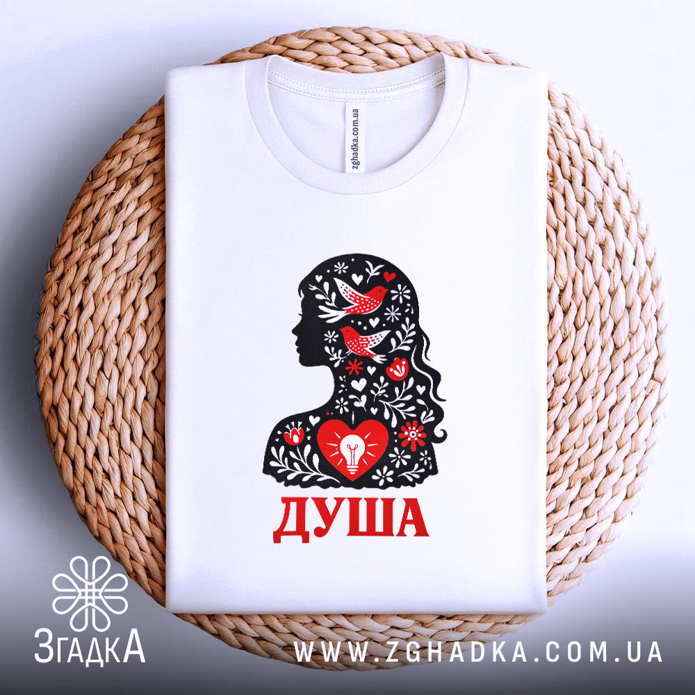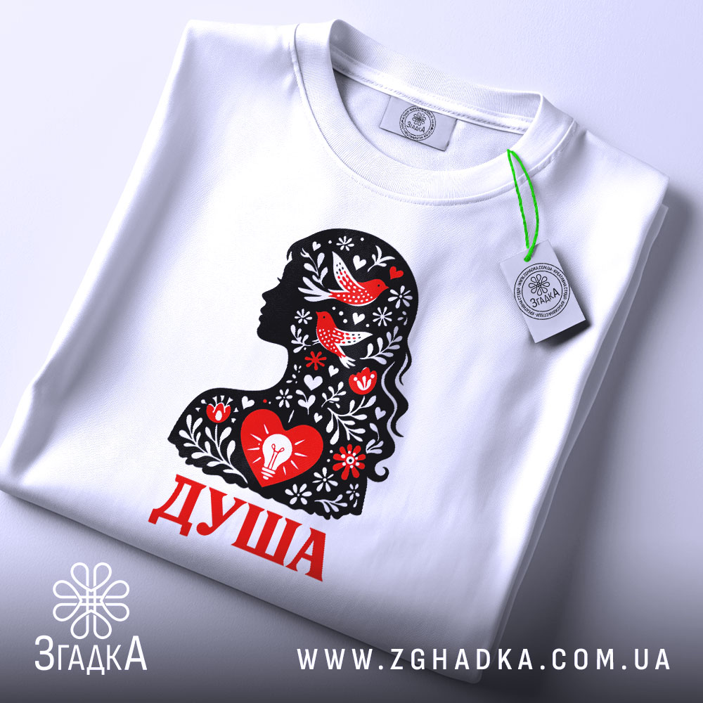 Футболка 'Душа український стиль' – це не просто одяг, а вираження вашої особистості. Принт символізує глибокий зв'язок з українською культурою, що робить цю футболку ідеальним вибором для патріотів та шанувальників мистецтва.