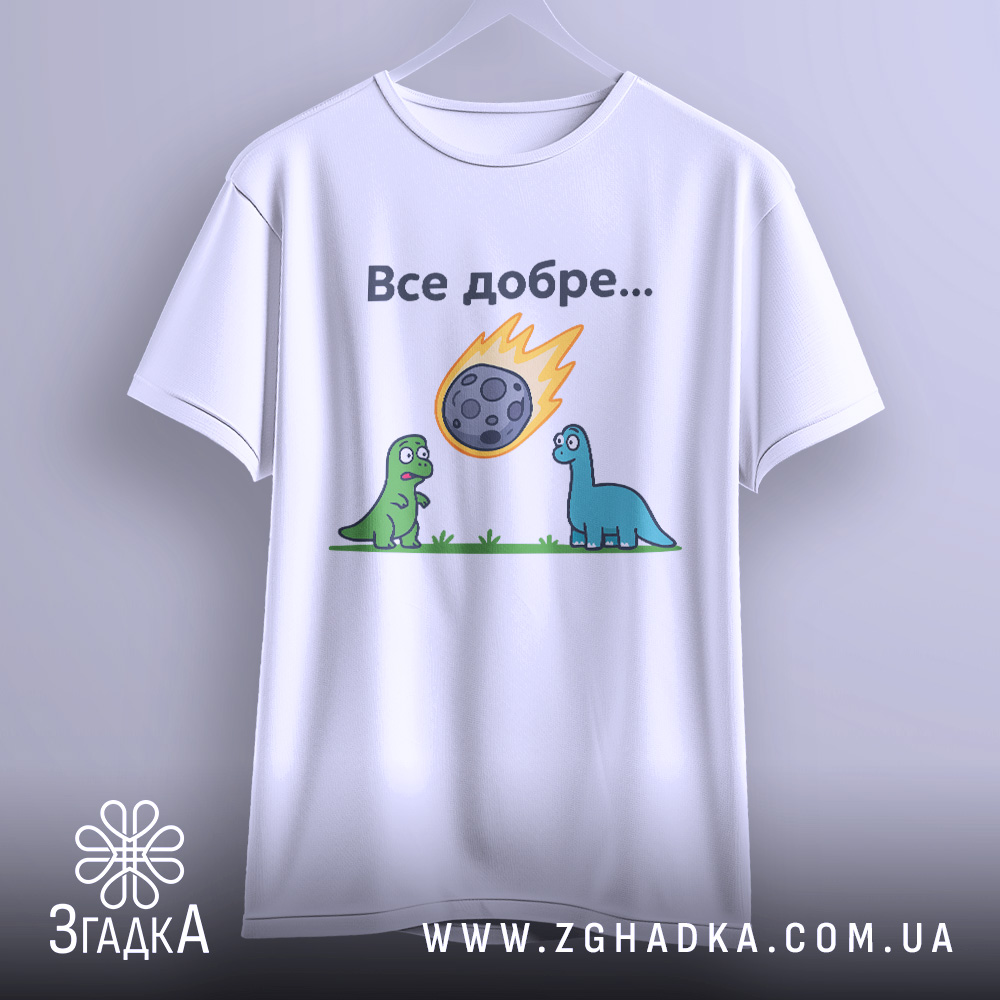 Ця футболка виготовлена з якісних матеріалів і має унікальний принт з динозаврами, що символізує веселощі та безтурботність. Вона підходить для будь-якого випадку, додаючи яскравості вашому образу.