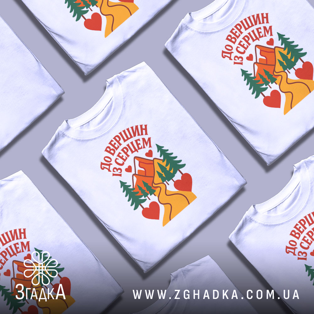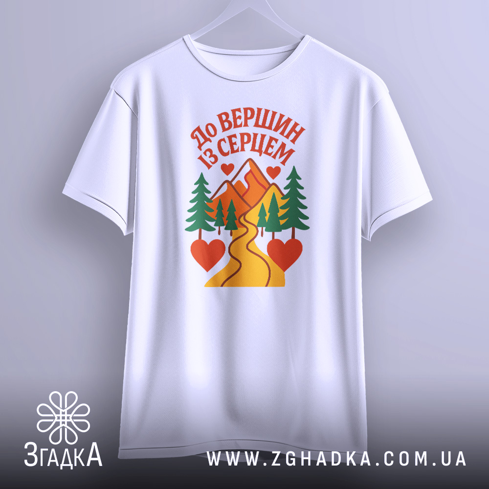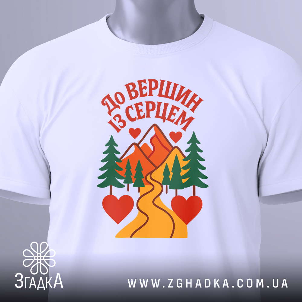 Футболка «Гірський пейзаж серце» — для тих, хто йде до своєї мети з любов’ю та пристрастю. Символ шляху, віри й натхнення, який нагадує: справжні вершини підкорюють серцем.